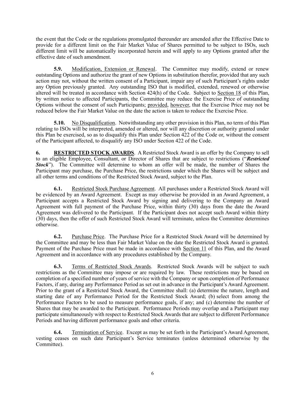 6 the event that the Code or the regulations promulgated thereunder are amended after the Effective Date to provide for a different limit on the Fair Market Value of Shares permitted to be subject to ISOs, such different limit will be automatically incorporated herein and will apply to any Options granted after the effective date of such amendment. 5.9. Modification, Extension or Renewal. The Committee may modify, extend or renew outstanding Options and authorize the grant of new Options in substitution therefor, provided that any such action may not, without the written consent of a Participant, impair any of such Participant’s rights under any Option previously granted. Any outstanding ISO that is modified, extended, renewed or otherwise altered will be treated in accordance with Section 424(h) of the Code. Subject to Section 18 of this Plan, by written notice to affected Participants, the Committee may reduce the Exercise Price of outstanding Options without the consent of such Participants; provided, however, that the Exercise Price may not be reduced below the Fair Market Value on the date the action is taken to reduce the Exercise Price. 5.10. No Disqualification. Notwithstanding any other provision in this Plan, no term of this Plan relating to ISOs will be interpreted, amended or altered, nor will any discretion or authority granted under this Plan be exercised, so as to disqualify this Plan under Section 422 of the Code or, without the consent of the Participant affected, to disqualify any ISO under Section 422 of the Code. 6. RESTRICTED STOCK AWARDS. A Restricted Stock Award is an offer by the Company to sell to an eligible Employee, Consultant, or Director of Shares that are subject to restrictions (“Restricted Stock”). The Committee will determine to whom an offer will be made, the number of Shares the Participant may purchase, the Purchase Price, the restrictions under which the Shares will be subject and all other terms and conditions of the Restricted Stock Award, subject to the Plan. 6.1. Restricted Stock Purchase Agreement. All purchases under a Restricted Stock Award will be evidenced by an Award Agreement. Except as may otherwise be provided in an Award Agreement, a Participant accepts a Restricted Stock Award by signing and delivering to the Company an Award Agreement with full payment of the Purchase Price, within thirty (30) days from the date the Award Agreement was delivered to the Participant. If the Participant does not accept such Award within thirty (30) days, then the offer of such Restricted Stock Award will terminate, unless the Committee determines otherwise. 6.2. Purchase Price. The Purchase Price for a Restricted Stock Award will be determined by the Committee and may be less than Fair Market Value on the date the Restricted Stock Award is granted. Payment of the Purchase Price must be made in accordance with Section 11 of this Plan, and the Award Agreement and in accordance with any procedures established by the Company. 6.3. Terms of Restricted Stock Awards. Restricted Stock Awards will be subject to such restrictions as the Committee may impose or are required by law. These restrictions may be based on completion of a specified number of years of service with the Company or upon completion of Performance Factors, if any, during any Performance Period as set out in advance in the Participant’s Award Agreement. Prior to the grant of a Restricted Stock Award, the Committee shall: (a) determine the nature, length and starting date of any Performance Period for the Restricted Stock Award; (b) select from among the Performance Factors to be used to measure performance goals, if any; and (c) determine the number of Shares that may be awarded to the Participant. Performance Periods may overlap and a Participant may participate simultaneously with respect to Restricted Stock Awards that are subject to different Performance Periods and having different performance goals and other criteria. 6.4. Termination of Service. Except as may be set forth in the Participant’s Award Agreement, vesting ceases on such date Participant’s Service terminates (unless determined otherwise by the Committee).