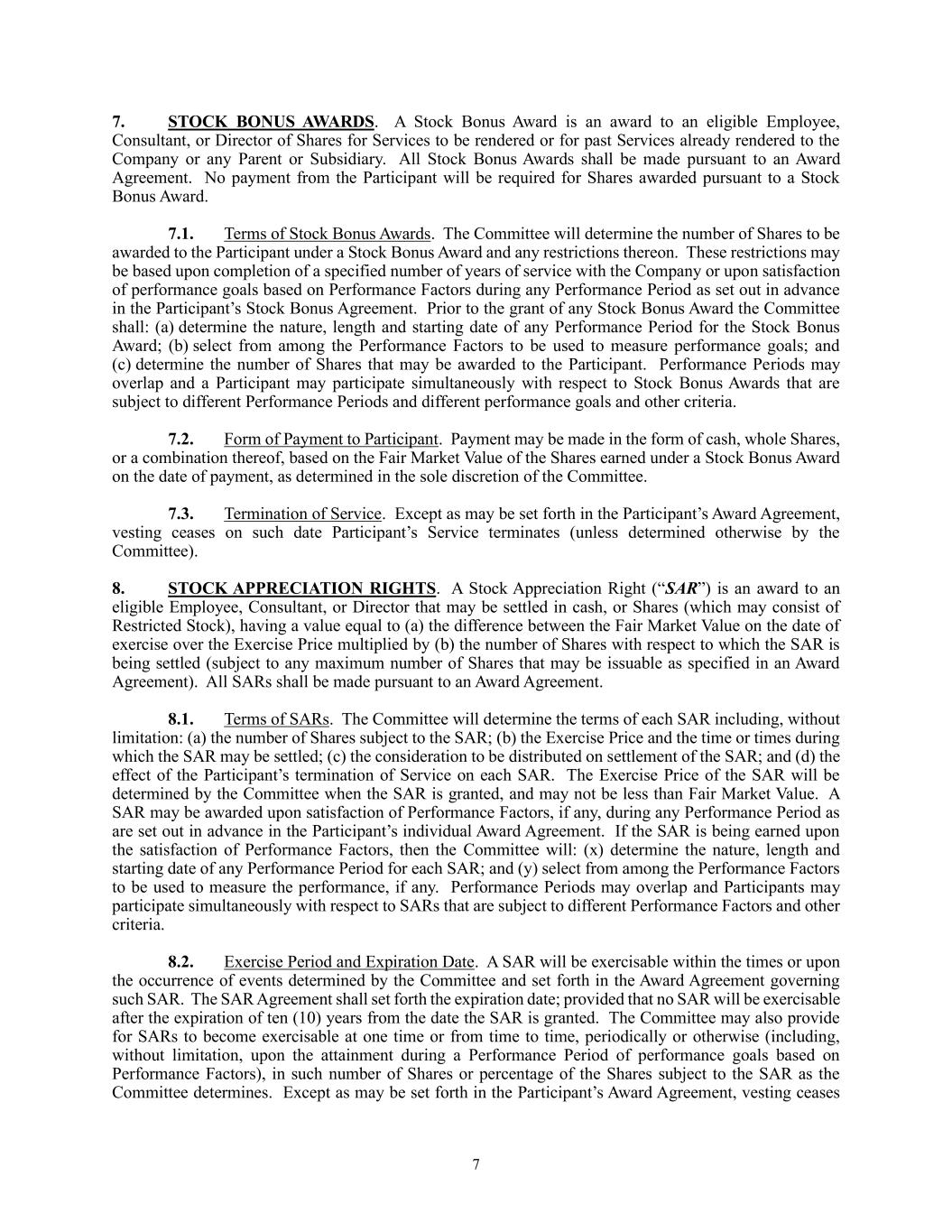 7 7. STOCK BONUS AWARDS. A Stock Bonus Award is an award to an eligible Employee, Consultant, or Director of Shares for Services to be rendered or for past Services already rendered to the Company or any Parent or Subsidiary. All Stock Bonus Awards shall be made pursuant to an Award Agreement. No payment from the Participant will be required for Shares awarded pursuant to a Stock Bonus Award. 7.1. Terms of Stock Bonus Awards. The Committee will determine the number of Shares to be awarded to the Participant under a Stock Bonus Award and any restrictions thereon. These restrictions may be based upon completion of a specified number of years of service with the Company or upon satisfaction of performance goals based on Performance Factors during any Performance Period as set out in advance in the Participant’s Stock Bonus Agreement. Prior to the grant of any Stock Bonus Award the Committee shall: (a) determine the nature, length and starting date of any Performance Period for the Stock Bonus Award; (b) select from among the Performance Factors to be used to measure performance goals; and (c) determine the number of Shares that may be awarded to the Participant. Performance Periods may overlap and a Participant may participate simultaneously with respect to Stock Bonus Awards that are subject to different Performance Periods and different performance goals and other criteria. 7.2. Form of Payment to Participant. Payment may be made in the form of cash, whole Shares, or a combination thereof, based on the Fair Market Value of the Shares earned under a Stock Bonus Award on the date of payment, as determined in the sole discretion of the Committee. 7.3. Termination of Service. Except as may be set forth in the Participant’s Award Agreement, vesting ceases on such date Participant’s Service terminates (unless determined otherwise by the Committee). 8. STOCK APPRECIATION RIGHTS. A Stock Appreciation Right (“SAR”) is an award to an eligible Employee, Consultant, or Director that may be settled in cash, or Shares (which may consist of Restricted Stock), having a value equal to (a) the difference between the Fair Market Value on the date of exercise over the Exercise Price multiplied by (b) the number of Shares with respect to which the SAR is being settled (subject to any maximum number of Shares that may be issuable as specified in an Award Agreement). All SARs shall be made pursuant to an Award Agreement. 8.1. Terms of SARs. The Committee will determine the terms of each SAR including, without limitation: (a) the number of Shares subject to the SAR; (b) the Exercise Price and the time or times during which the SAR may be settled; (c) the consideration to be distributed on settlement of the SAR; and (d) the effect of the Participant’s termination of Service on each SAR. The Exercise Price of the SAR will be determined by the Committee when the SAR is granted, and may not be less than Fair Market Value. A SAR may be awarded upon satisfaction of Performance Factors, if any, during any Performance Period as are set out in advance in the Participant’s individual Award Agreement. If the SAR is being earned upon the satisfaction of Performance Factors, then the Committee will: (x) determine the nature, length and starting date of any Performance Period for each SAR; and (y) select from among the Performance Factors to be used to measure the performance, if any. Performance Periods may overlap and Participants may participate simultaneously with respect to SARs that are subject to different Performance Factors and other criteria. 8.2. Exercise Period and Expiration Date. A SAR will be exercisable within the times or upon the occurrence of events determined by the Committee and set forth in the Award Agreement governing such SAR. The SAR Agreement shall set forth the expiration date; provided that no SAR will be exercisable after the expiration of ten (10) years from the date the SAR is granted. The Committee may also provide for SARs to become exercisable at one time or from time to time, periodically or otherwise (including, without limitation, upon the attainment during a Performance Period of performance goals based on Performance Factors), in such number of Shares or percentage of the Shares subject to the SAR as the Committee determines. Except as may be set forth in the Participant’s Award Agreement, vesting ceases