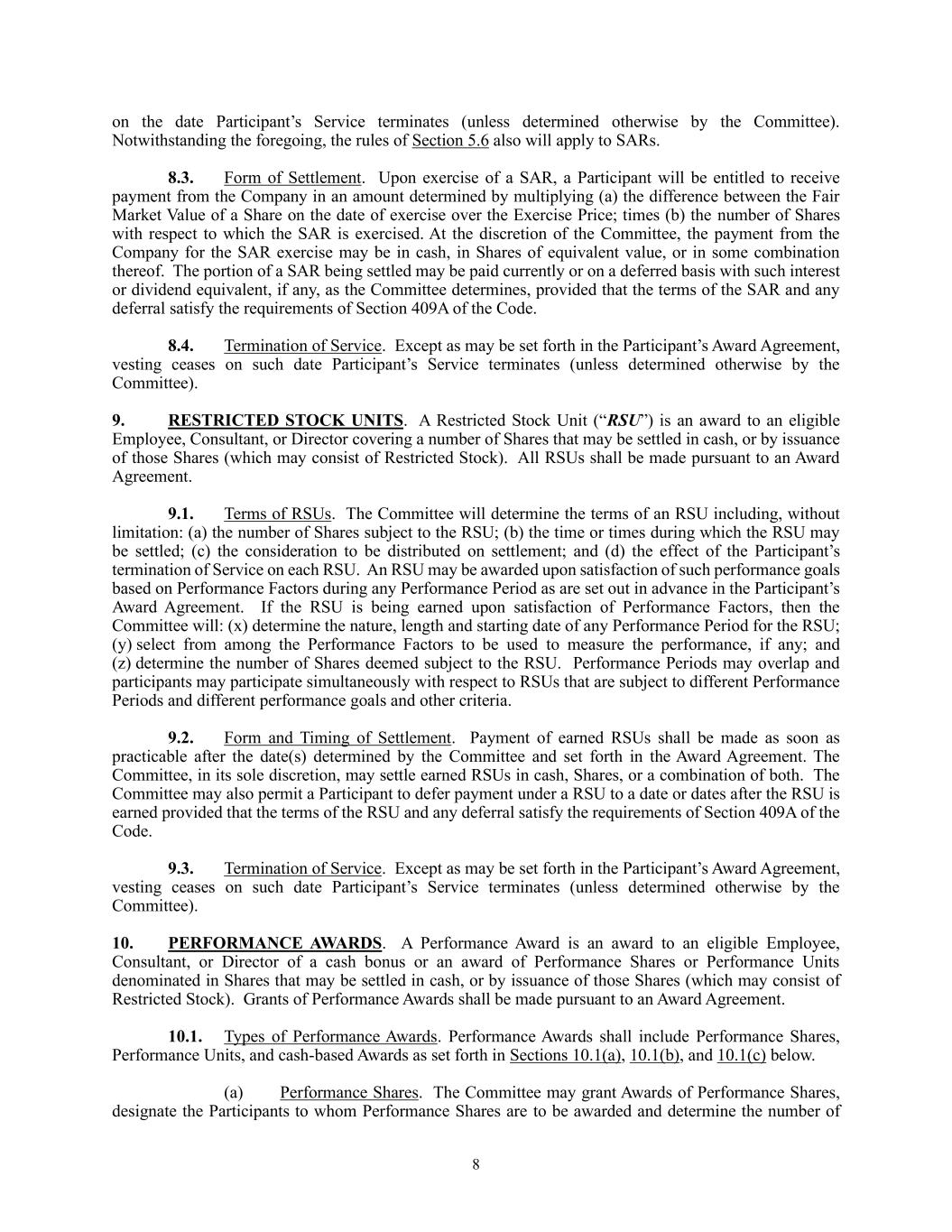 8 on the date Participant’s Service terminates (unless determined otherwise by the Committee). Notwithstanding the foregoing, the rules of Section 5.6 also will apply to SARs. 8.3. Form of Settlement. Upon exercise of a SAR, a Participant will be entitled to receive payment from the Company in an amount determined by multiplying (a) the difference between the Fair Market Value of a Share on the date of exercise over the Exercise Price; times (b) the number of Shares with respect to which the SAR is exercised. At the discretion of the Committee, the payment from the Company for the SAR exercise may be in cash, in Shares of equivalent value, or in some combination thereof. The portion of a SAR being settled may be paid currently or on a deferred basis with such interest or dividend equivalent, if any, as the Committee determines, provided that the terms of the SAR and any deferral satisfy the requirements of Section 409A of the Code. 8.4. Termination of Service. Except as may be set forth in the Participant’s Award Agreement, vesting ceases on such date Participant’s Service terminates (unless determined otherwise by the Committee). 9. RESTRICTED STOCK UNITS. A Restricted Stock Unit (“RSU”) is an award to an eligible Employee, Consultant, or Director covering a number of Shares that may be settled in cash, or by issuance of those Shares (which may consist of Restricted Stock). All RSUs shall be made pursuant to an Award Agreement. 9.1. Terms of RSUs. The Committee will determine the terms of an RSU including, without limitation: (a) the number of Shares subject to the RSU; (b) the time or times during which the RSU may be settled; (c) the consideration to be distributed on settlement; and (d) the effect of the Participant’s termination of Service on each RSU. An RSU may be awarded upon satisfaction of such performance goals based on Performance Factors during any Performance Period as are set out in advance in the Participant’s Award Agreement. If the RSU is being earned upon satisfaction of Performance Factors, then the Committee will: (x) determine the nature, length and starting date of any Performance Period for the RSU; (y) select from among the Performance Factors to be used to measure the performance, if any; and (z) determine the number of Shares deemed subject to the RSU. Performance Periods may overlap and participants may participate simultaneously with respect to RSUs that are subject to different Performance Periods and different performance goals and other criteria. 9.2. Form and Timing of Settlement. Payment of earned RSUs shall be made as soon as practicable after the date(s) determined by the Committee and set forth in the Award Agreement. The Committee, in its sole discretion, may settle earned RSUs in cash, Shares, or a combination of both. The Committee may also permit a Participant to defer payment under a RSU to a date or dates after the RSU is earned provided that the terms of the RSU and any deferral satisfy the requirements of Section 409A of the Code. 9.3. Termination of Service. Except as may be set forth in the Participant’s Award Agreement, vesting ceases on such date Participant’s Service terminates (unless determined otherwise by the Committee). 10. PERFORMANCE AWARDS. A Performance Award is an award to an eligible Employee, Consultant, or Director of a cash bonus or an award of Performance Shares or Performance Units denominated in Shares that may be settled in cash, or by issuance of those Shares (which may consist of Restricted Stock). Grants of Performance Awards shall be made pursuant to an Award Agreement. 10.1. Types of Performance Awards. Performance Awards shall include Performance Shares, Performance Units, and cash-based Awards as set forth in Sections 10.1(a), 10.1(b), and 10.1(c) below. (a) Performance Shares. The Committee may grant Awards of Performance Shares, designate the Participants to whom Performance Shares are to be awarded and determine the number of