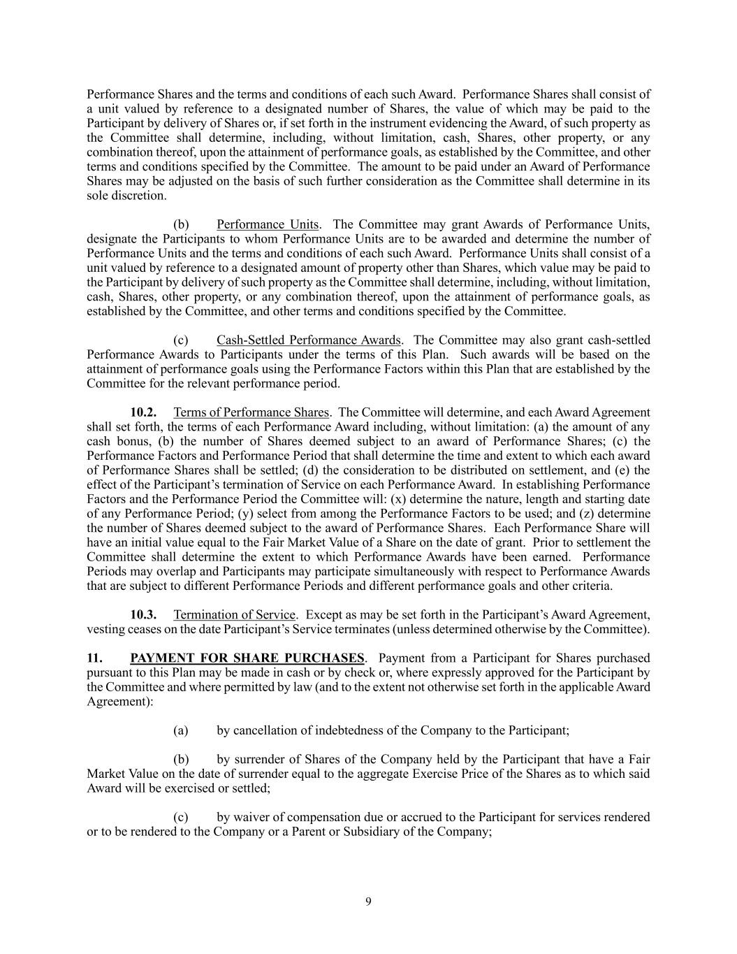 9 Performance Shares and the terms and conditions of each such Award. Performance Shares shall consist of a unit valued by reference to a designated number of Shares, the value of which may be paid to the Participant by delivery of Shares or, if set forth in the instrument evidencing the Award, of such property as the Committee shall determine, including, without limitation, cash, Shares, other property, or any combination thereof, upon the attainment of performance goals, as established by the Committee, and other terms and conditions specified by the Committee. The amount to be paid under an Award of Performance Shares may be adjusted on the basis of such further consideration as the Committee shall determine in its sole discretion. (b) Performance Units. The Committee may grant Awards of Performance Units, designate the Participants to whom Performance Units are to be awarded and determine the number of Performance Units and the terms and conditions of each such Award. Performance Units shall consist of a unit valued by reference to a designated amount of property other than Shares, which value may be paid to the Participant by delivery of such property as the Committee shall determine, including, without limitation, cash, Shares, other property, or any combination thereof, upon the attainment of performance goals, as established by the Committee, and other terms and conditions specified by the Committee. (c) Cash-Settled Performance Awards. The Committee may also grant cash-settled Performance Awards to Participants under the terms of this Plan. Such awards will be based on the attainment of performance goals using the Performance Factors within this Plan that are established by the Committee for the relevant performance period. 10.2. Terms of Performance Shares. The Committee will determine, and each Award Agreement shall set forth, the terms of each Performance Award including, without limitation: (a) the amount of any cash bonus, (b) the number of Shares deemed subject to an award of Performance Shares; (c) the Performance Factors and Performance Period that shall determine the time and extent to which each award of Performance Shares shall be settled; (d) the consideration to be distributed on settlement, and (e) the effect of the Participant’s termination of Service on each Performance Award. In establishing Performance Factors and the Performance Period the Committee will: (x) determine the nature, length and starting date of any Performance Period; (y) select from among the Performance Factors to be used; and (z) determine the number of Shares deemed subject to the award of Performance Shares. Each Performance Share will have an initial value equal to the Fair Market Value of a Share on the date of grant. Prior to settlement the Committee shall determine the extent to which Performance Awards have been earned. Performance Periods may overlap and Participants may participate simultaneously with respect to Performance Awards that are subject to different Performance Periods and different performance goals and other criteria. 10.3. Termination of Service. Except as may be set forth in the Participant’s Award Agreement, vesting ceases on the date Participant’s Service terminates (unless determined otherwise by the Committee). 11. PAYMENT FOR SHARE PURCHASES. Payment from a Participant for Shares purchased pursuant to this Plan may be made in cash or by check or, where expressly approved for the Participant by the Committee and where permitted by law (and to the extent not otherwise set forth in the applicable Award Agreement): (a) by cancellation of indebtedness of the Company to the Participant; (b) by surrender of Shares of the Company held by the Participant that have a Fair Market Value on the date of surrender equal to the aggregate Exercise Price of the Shares as to which said Award will be exercised or settled; (c) by waiver of compensation due or accrued to the Participant for services rendered or to be rendered to the Company or a Parent or Subsidiary of the Company;