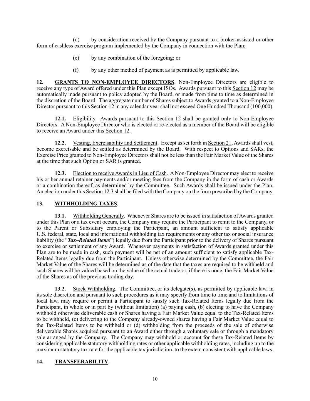 10 (d) by consideration received by the Company pursuant to a broker-assisted or other form of cashless exercise program implemented by the Company in connection with the Plan; (e) by any combination of the foregoing; or (f) by any other method of payment as is permitted by applicable law. 12. GRANTS TO NON-EMPLOYEE DIRECTORS. Non-Employee Directors are eligible to receive any type of Award offered under this Plan except ISOs. Awards pursuant to this Section 12 may be automatically made pursuant to policy adopted by the Board, or made from time to time as determined in the discretion of the Board. The aggregate number of Shares subject to Awards granted to a Non-Employee Director pursuant to this Section 12 in any calendar year shall not exceed One Hundred Thousand (100,000). 12.1. Eligibility. Awards pursuant to this Section 12 shall be granted only to Non-Employee Directors. A Non-Employee Director who is elected or re-elected as a member of the Board will be eligible to receive an Award under this Section 12. 12.2. Vesting, Exercisability and Settlement. Except as set forth in Section 21, Awards shall vest, become exercisable and be settled as determined by the Board. With respect to Options and SARs, the Exercise Price granted to Non-Employee Directors shall not be less than the Fair Market Value of the Shares at the time that such Option or SAR is granted. 12.3. Election to receive Awards in Lieu of Cash. A Non-Employee Director may elect to receive his or her annual retainer payments and/or meeting fees from the Company in the form of cash or Awards or a combination thereof, as determined by the Committee. Such Awards shall be issued under the Plan. An election under this Section 12.3 shall be filed with the Company on the form prescribed by the Company. 13. WITHHOLDING TAXES. 13.1. Withholding Generally. Whenever Shares are to be issued in satisfaction of Awards granted under this Plan or a tax event occurs, the Company may require the Participant to remit to the Company, or to the Parent or Subsidiary employing the Participant, an amount sufficient to satisfy applicable U.S. federal, state, local and international withholding tax requirements or any other tax or social insurance liability (the “Tax–Related Items”) legally due from the Participant prior to the delivery of Shares pursuant to exercise or settlement of any Award. Whenever payments in satisfaction of Awards granted under this Plan are to be made in cash, such payment will be net of an amount sufficient to satisfy applicable Tax- Related Items legally due from the Participant. Unless otherwise determined by the Committee, the Fair Market Value of the Shares will be determined as of the date that the taxes are required to be withheld and such Shares will be valued based on the value of the actual trade or, if there is none, the Fair Market Value of the Shares as of the previous trading day. 13.2. Stock Withholding. The Committee, or its delegate(s), as permitted by applicable law, in its sole discretion and pursuant to such procedures as it may specify from time to time and to limitations of local law, may require or permit a Participant to satisfy such Tax-Related Items legally due from the Participant, in whole or in part by (without limitation) (a) paying cash, (b) electing to have the Company withhold otherwise deliverable cash or Shares having a Fair Market Value equal to the Tax-Related Items to be withheld, (c) delivering to the Company already-owned shares having a Fair Market Value equal to the Tax-Related Items to be withheld or (d) withholding from the proceeds of the sale of otherwise deliverable Shares acquired pursuant to an Award either through a voluntary sale or through a mandatory sale arranged by the Company. The Company may withhold or account for these Tax-Related Items by considering applicable statutory withholding rates or other applicable withholding rates, including up to the maximum statutory tax rate for the applicable tax jurisdiction, to the extent consistent with applicable laws. 14. TRANSFERABILITY.