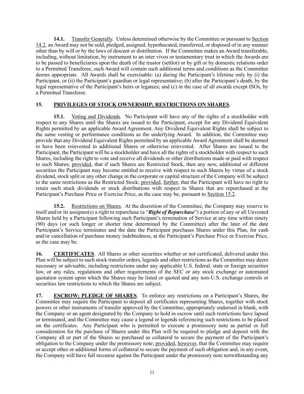 11 14.1. Transfer Generally. Unless determined otherwise by the Committee or pursuant to Section 14.2, an Award may not be sold, pledged, assigned, hypothecated, transferred, or disposed of in any manner other than by will or by the laws of descent or distribution. If the Committee makes an Award transferable, including, without limitation, by instrument to an inter vivos or testamentary trust in which the Awards are to be passed to beneficiaries upon the death of the trustor (settlor) or by gift or by domestic relations order to a Permitted Transferee, such Award will contain such additional terms and conditions as the Committee deems appropriate. All Awards shall be exercisable: (a) during the Participant’s lifetime only by (i) the Participant, or (ii) the Participant’s guardian or legal representative; (b) after the Participant’s death, by the legal representative of the Participant’s heirs or legatees; and (c) in the case of all awards except ISOs, by a Permitted Transferee. 15. PRIVILEGES OF STOCK OWNERSHIP; RESTRICTIONS ON SHARES. 15.1. Voting and Dividends. No Participant will have any of the rights of a stockholder with respect to any Shares until the Shares are issued to the Participant, except for any Dividend Equivalent Rights permitted by an applicable Award Agreement. Any Dividend Equivalent Rights shall be subject to the same vesting or performance conditions as the underlying Award. In addition, the Committee may provide that any Dividend Equivalent Rights permitted by an applicable Award Agreement shall be deemed to have been reinvested in additional Shares or otherwise reinvested. After Shares are issued to the Participant, the Participant will be a stockholder and have all the rights of a stockholder with respect to such Shares, including the right to vote and receive all dividends or other distributions made or paid with respect to such Shares; provided, that if such Shares are Restricted Stock, then any new, additional or different securities the Participant may become entitled to receive with respect to such Shares by virtue of a stock dividend, stock split or any other change in the corporate or capital structure of the Company will be subject to the same restrictions as the Restricted Stock; provided, further, that the Participant will have no right to retain such stock dividends or stock distributions with respect to Shares that are repurchased at the Participant’s Purchase Price or Exercise Price, as the case may be, pursuant to Section 15.2. 15.2. Restrictions on Shares. At the discretion of the Committee, the Company may reserve to itself and/or its assignee(s) a right to repurchase (a “Right of Repurchase”) a portion of any or all Unvested Shares held by a Participant following such Participant’s termination of Service at any time within ninety (90) days (or such longer or shorter time determined by the Committee) after the later of the date Participant’s Service terminates and the date the Participant purchases Shares under this Plan, for cash and/or cancellation of purchase money indebtedness, at the Participant’s Purchase Price or Exercise Price, as the case may be. 16. CERTIFICATES. All Shares or other securities whether or not certificated, delivered under this Plan will be subject to such stock transfer orders, legends and other restrictions as the Committee may deem necessary or advisable, including restrictions under any applicable U.S. federal, state or foreign securities law, or any rules, regulations and other requirements of the SEC or any stock exchange or automated quotation system upon which the Shares may be listed or quoted and any non-U.S. exchange controls or securities law restrictions to which the Shares are subject. 17. ESCROW; PLEDGE OF SHARES. To enforce any restrictions on a Participant’s Shares, the Committee may require the Participant to deposit all certificates representing Shares, together with stock powers or other instruments of transfer approved by the Committee, appropriately endorsed in blank, with the Company or an agent designated by the Company to hold in escrow until such restrictions have lapsed or terminated, and the Committee may cause a legend or legends referencing such restrictions to be placed on the certificates. Any Participant who is permitted to execute a promissory note as partial or full consideration for the purchase of Shares under this Plan will be required to pledge and deposit with the Company all or part of the Shares so purchased as collateral to secure the payment of the Participant’s obligation to the Company under the promissory note; provided, however, that the Committee may require or accept other or additional forms of collateral to secure the payment of such obligation and, in any event, the Company will have full recourse against the Participant under the promissory note notwithstanding any