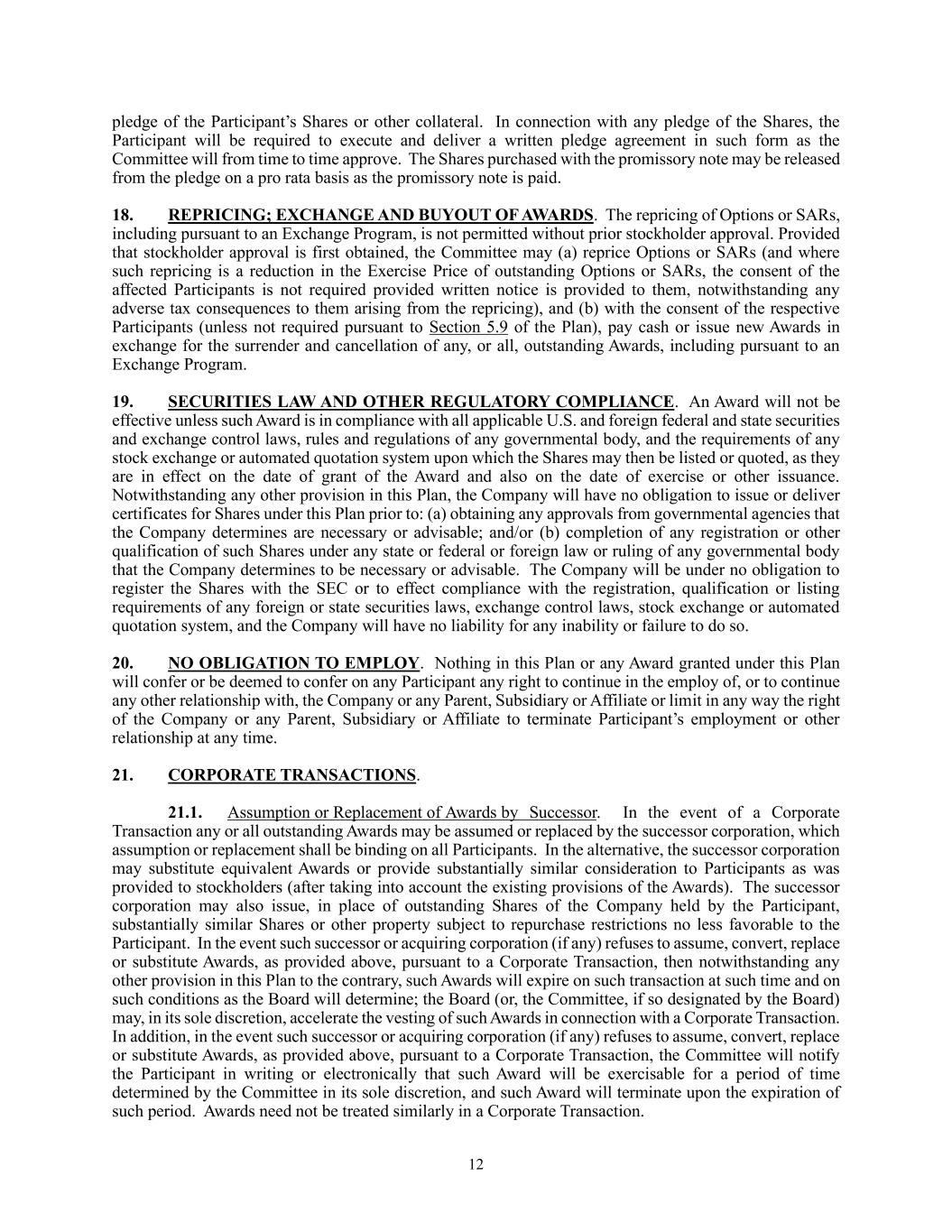 12 pledge of the Participant’s Shares or other collateral. In connection with any pledge of the Shares, the Participant will be required to execute and deliver a written pledge agreement in such form as the Committee will from time to time approve. The Shares purchased with the promissory note may be released from the pledge on a pro rata basis as the promissory note is paid. 18. REPRICING; EXCHANGE AND BUYOUT OF AWARDS. The repricing of Options or SARs, including pursuant to an Exchange Program, is not permitted without prior stockholder approval. Provided that stockholder approval is first obtained, the Committee may (a) reprice Options or SARs (and where such repricing is a reduction in the Exercise Price of outstanding Options or SARs, the consent of the affected Participants is not required provided written notice is provided to them, notwithstanding any adverse tax consequences to them arising from the repricing), and (b) with the consent of the respective Participants (unless not required pursuant to Section 5.9 of the Plan), pay cash or issue new Awards in exchange for the surrender and cancellation of any, or all, outstanding Awards, including pursuant to an Exchange Program. 19. SECURITIES LAW AND OTHER REGULATORY COMPLIANCE. An Award will not be effective unless such Award is in compliance with all applicable U.S. and foreign federal and state securities and exchange control laws, rules and regulations of any governmental body, and the requirements of any stock exchange or automated quotation system upon which the Shares may then be listed or quoted, as they are in effect on the date of grant of the Award and also on the date of exercise or other issuance. Notwithstanding any other provision in this Plan, the Company will have no obligation to issue or deliver certificates for Shares under this Plan prior to: (a) obtaining any approvals from governmental agencies that the Company determines are necessary or advisable; and/or (b) completion of any registration or other qualification of such Shares under any state or federal or foreign law or ruling of any governmental body that the Company determines to be necessary or advisable. The Company will be under no obligation to register the Shares with the SEC or to effect compliance with the registration, qualification or listing requirements of any foreign or state securities laws, exchange control laws, stock exchange or automated quotation system, and the Company will have no liability for any inability or failure to do so. 20. NO OBLIGATION TO EMPLOY. Nothing in this Plan or any Award granted under this Plan will confer or be deemed to confer on any Participant any right to continue in the employ of, or to continue any other relationship with, the Company or any Parent, Subsidiary or Affiliate or limit in any way the right of the Company or any Parent, Subsidiary or Affiliate to terminate Participant’s employment or other relationship at any time. 21. CORPORATE TRANSACTIONS. 21.1. Assumption or Replacement of Awards by Successor. In the event of a Corporate Transaction any or all outstanding Awards may be assumed or replaced by the successor corporation, which assumption or replacement shall be binding on all Participants. In the alternative, the successor corporation may substitute equivalent Awards or provide substantially similar consideration to Participants as was provided to stockholders (after taking into account the existing provisions of the Awards). The successor corporation may also issue, in place of outstanding Shares of the Company held by the Participant, substantially similar Shares or other property subject to repurchase restrictions no less favorable to the Participant. In the event such successor or acquiring corporation (if any) refuses to assume, convert, replace or substitute Awards, as provided above, pursuant to a Corporate Transaction, then notwithstanding any other provision in this Plan to the contrary, such Awards will expire on such transaction at such time and on such conditions as the Board will determine; the Board (or, the Committee, if so designated by the Board) may, in its sole discretion, accelerate the vesting of such Awards in connection with a Corporate Transaction. In addition, in the event such successor or acquiring corporation (if any) refuses to assume, convert, replace or substitute Awards, as provided above, pursuant to a Corporate Transaction, the Committee will notify the Participant in writing or electronically that such Award will be exercisable for a period of time determined by the Committee in its sole discretion, and such Award will terminate upon the expiration of such period. Awards need not be treated similarly in a Corporate Transaction.