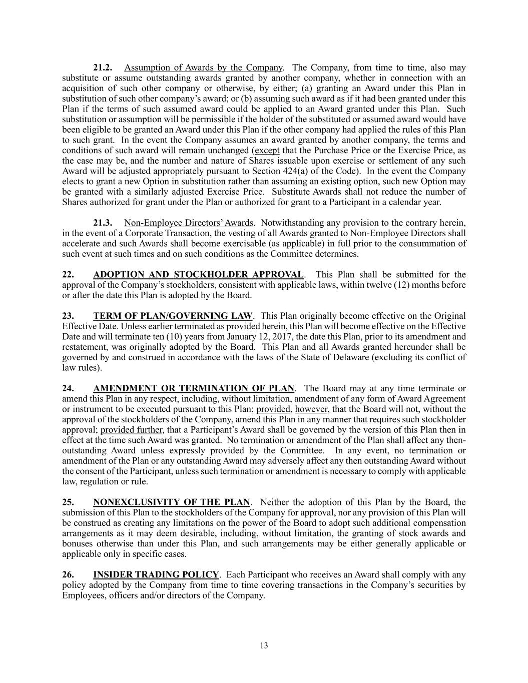 13 21.2. Assumption of Awards by the Company. The Company, from time to time, also may substitute or assume outstanding awards granted by another company, whether in connection with an acquisition of such other company or otherwise, by either; (a) granting an Award under this Plan in substitution of such other company’s award; or (b) assuming such award as if it had been granted under this Plan if the terms of such assumed award could be applied to an Award granted under this Plan. Such substitution or assumption will be permissible if the holder of the substituted or assumed award would have been eligible to be granted an Award under this Plan if the other company had applied the rules of this Plan to such grant. In the event the Company assumes an award granted by another company, the terms and conditions of such award will remain unchanged (except that the Purchase Price or the Exercise Price, as the case may be, and the number and nature of Shares issuable upon exercise or settlement of any such Award will be adjusted appropriately pursuant to Section 424(a) of the Code). In the event the Company elects to grant a new Option in substitution rather than assuming an existing option, such new Option may be granted with a similarly adjusted Exercise Price. Substitute Awards shall not reduce the number of Shares authorized for grant under the Plan or authorized for grant to a Participant in a calendar year. 21.3. Non-Employee Directors’ Awards. Notwithstanding any provision to the contrary herein, in the event of a Corporate Transaction, the vesting of all Awards granted to Non-Employee Directors shall accelerate and such Awards shall become exercisable (as applicable) in full prior to the consummation of such event at such times and on such conditions as the Committee determines. 22. ADOPTION AND STOCKHOLDER APPROVAL. This Plan shall be submitted for the approval of the Company’s stockholders, consistent with applicable laws, within twelve (12) months before or after the date this Plan is adopted by the Board. 23. TERM OF PLAN/GOVERNING LAW. This Plan originally become effective on the Original Effective Date. Unless earlier terminated as provided herein, this Plan will become effective on the Effective Date and will terminate ten (10) years from January 12, 2017, the date this Plan, prior to its amendment and restatement, was originally adopted by the Board. This Plan and all Awards granted hereunder shall be governed by and construed in accordance with the laws of the State of Delaware (excluding its conflict of law rules). 24. AMENDMENT OR TERMINATION OF PLAN. The Board may at any time terminate or amend this Plan in any respect, including, without limitation, amendment of any form of Award Agreement or instrument to be executed pursuant to this Plan; provided, however, that the Board will not, without the approval of the stockholders of the Company, amend this Plan in any manner that requires such stockholder approval; provided further, that a Participant’s Award shall be governed by the version of this Plan then in effect at the time such Award was granted. No termination or amendment of the Plan shall affect any then- outstanding Award unless expressly provided by the Committee. In any event, no termination or amendment of the Plan or any outstanding Award may adversely affect any then outstanding Award without the consent of the Participant, unless such termination or amendment is necessary to comply with applicable law, regulation or rule. 25. NONEXCLUSIVITY OF THE PLAN. Neither the adoption of this Plan by the Board, the submission of this Plan to the stockholders of the Company for approval, nor any provision of this Plan will be construed as creating any limitations on the power of the Board to adopt such additional compensation arrangements as it may deem desirable, including, without limitation, the granting of stock awards and bonuses otherwise than under this Plan, and such arrangements may be either generally applicable or applicable only in specific cases. 26. INSIDER TRADING POLICY. Each Participant who receives an Award shall comply with any policy adopted by the Company from time to time covering transactions in the Company’s securities by Employees, officers and/or directors of the Company.