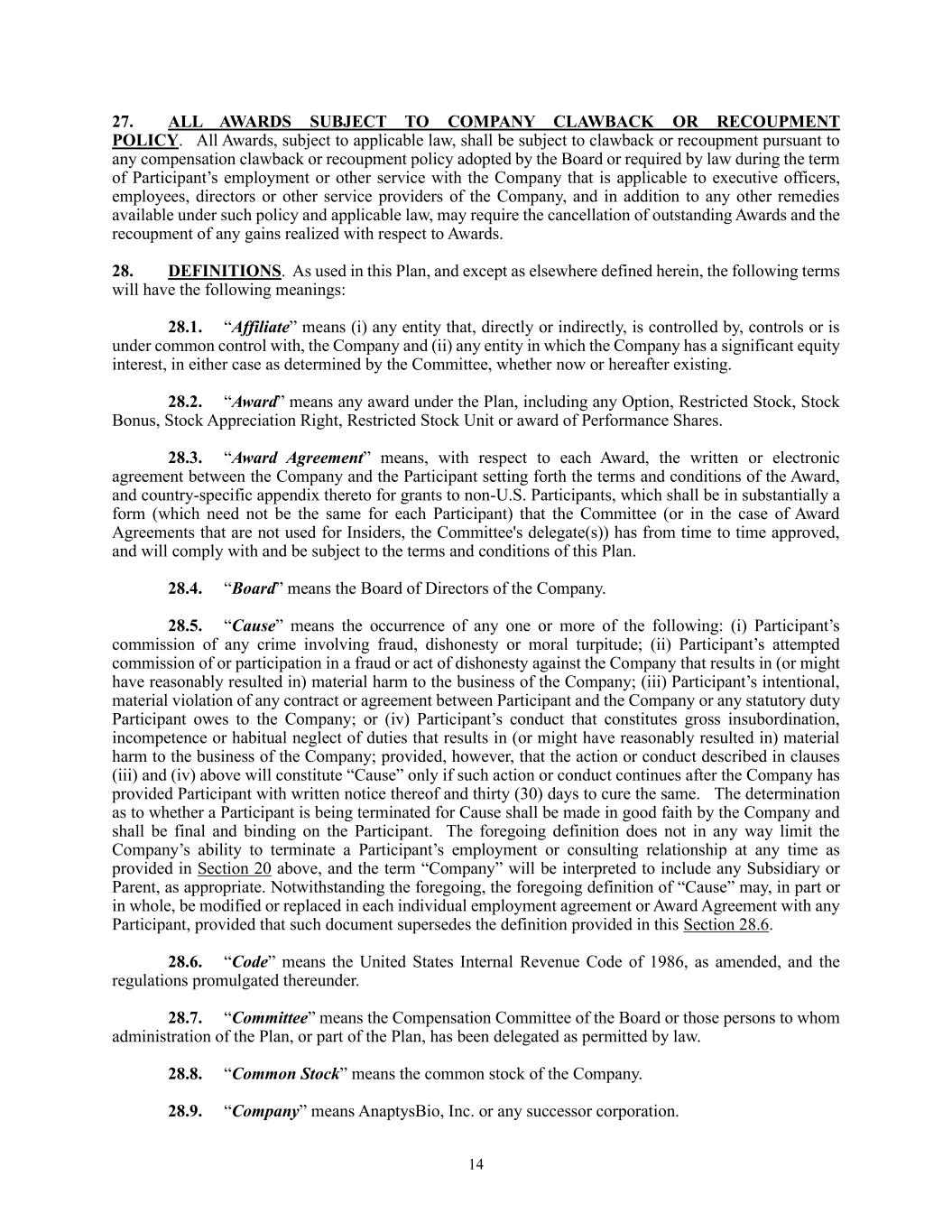 14 27. ALL AWARDS SUBJECT TO COMPANY CLAWBACK OR RECOUPMENT POLICY. All Awards, subject to applicable law, shall be subject to clawback or recoupment pursuant to any compensation clawback or recoupment policy adopted by the Board or required by law during the term of Participant’s employment or other service with the Company that is applicable to executive officers, employees, directors or other service providers of the Company, and in addition to any other remedies available under such policy and applicable law, may require the cancellation of outstanding Awards and the recoupment of any gains realized with respect to Awards. 28. DEFINITIONS. As used in this Plan, and except as elsewhere defined herein, the following terms will have the following meanings: 28.1. “Affiliate” means (i) any entity that, directly or indirectly, is controlled by, controls or is under common control with, the Company and (ii) any entity in which the Company has a significant equity interest, in either case as determined by the Committee, whether now or hereafter existing. 28.2. “Award” means any award under the Plan, including any Option, Restricted Stock, Stock Bonus, Stock Appreciation Right, Restricted Stock Unit or award of Performance Shares. 28.3. “Award Agreement” means, with respect to each Award, the written or electronic agreement between the Company and the Participant setting forth the terms and conditions of the Award, and country-specific appendix thereto for grants to non-U.S. Participants, which shall be in substantially a form (which need not be the same for each Participant) that the Committee (or in the case of Award Agreements that are not used for Insiders, the Committee's delegate(s)) has from time to time approved, and will comply with and be subject to the terms and conditions of this Plan. 28.4. “Board” means the Board of Directors of the Company. 28.5. “Cause” means the occurrence of any one or more of the following: (i) Participant’s commission of any crime involving fraud, dishonesty or moral turpitude; (ii) Participant’s attempted commission of or participation in a fraud or act of dishonesty against the Company that results in (or might have reasonably resulted in) material harm to the business of the Company; (iii) Participant’s intentional, material violation of any contract or agreement between Participant and the Company or any statutory duty Participant owes to the Company; or (iv) Participant’s conduct that constitutes gross insubordination, incompetence or habitual neglect of duties that results in (or might have reasonably resulted in) material harm to the business of the Company; provided, however, that the action or conduct described in clauses (iii) and (iv) above will constitute “Cause” only if such action or conduct continues after the Company has provided Participant with written notice thereof and thirty (30) days to cure the same. The determination as to whether a Participant is being terminated for Cause shall be made in good faith by the Company and shall be final and binding on the Participant. The foregoing definition does not in any way limit the Company’s ability to terminate a Participant’s employment or consulting relationship at any time as provided in Section 20 above, and the term “Company” will be interpreted to include any Subsidiary or Parent, as appropriate. Notwithstanding the foregoing, the foregoing definition of “Cause” may, in part or in whole, be modified or replaced in each individual employment agreement or Award Agreement with any Participant, provided that such document supersedes the definition provided in this Section 28.6. 28.6. “Code” means the United States Internal Revenue Code of 1986, as amended, and the regulations promulgated thereunder. 28.7. “Committee” means the Compensation Committee of the Board or those persons to whom administration of the Plan, or part of the Plan, has been delegated as permitted by law. 28.8. “Common Stock” means the common stock of the Company. 28.9. “Company” means AnaptysBio, Inc. or any successor corporation.