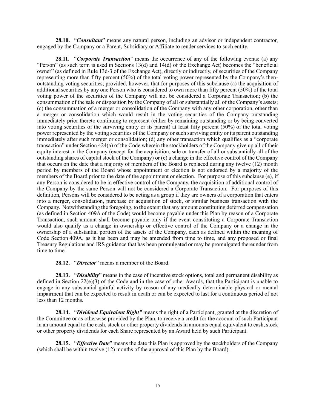 15 28.10. “Consultant” means any natural person, including an advisor or independent contractor, engaged by the Company or a Parent, Subsidiary or Affiliate to render services to such entity. 28.11. “Corporate Transaction” means the occurrence of any of the following events: (a) any “Person” (as such term is used in Sections 13(d) and 14(d) of the Exchange Act) becomes the “beneficial owner” (as defined in Rule 13d-3 of the Exchange Act), directly or indirectly, of securities of the Company representing more than fifty percent (50%) of the total voting power represented by the Company’s then- outstanding voting securities; provided, however, that for purposes of this subclause (a) the acquisition of additional securities by any one Person who is considered to own more than fifty percent (50%) of the total voting power of the securities of the Company will not be considered a Corporate Transaction; (b) the consummation of the sale or disposition by the Company of all or substantially all of the Company’s assets; (c) the consummation of a merger or consolidation of the Company with any other corporation, other than a merger or consolidation which would result in the voting securities of the Company outstanding immediately prior thereto continuing to represent (either by remaining outstanding or by being converted into voting securities of the surviving entity or its parent) at least fifty percent (50%) of the total voting power represented by the voting securities of the Company or such surviving entity or its parent outstanding immediately after such merger or consolidation; (d) any other transaction which qualifies as a “corporate transaction” under Section 424(a) of the Code wherein the stockholders of the Company give up all of their equity interest in the Company (except for the acquisition, sale or transfer of all or substantially all of the outstanding shares of capital stock of the Company) or (e) a change in the effective control of the Company that occurs on the date that a majority of members of the Board is replaced during any twelve (12) month period by members of the Board whose appointment or election is not endorsed by a majority of the members of the Board prior to the date of the appointment or election. For purpose of this subclause (e), if any Person is considered to be in effective control of the Company, the acquisition of additional control of the Company by the same Person will not be considered a Corporate Transaction. For purposes of this definition, Persons will be considered to be acting as a group if they are owners of a corporation that enters into a merger, consolidation, purchase or acquisition of stock, or similar business transaction with the Company. Notwithstanding the foregoing, to the extent that any amount constituting deferred compensation (as defined in Section 409A of the Code) would become payable under this Plan by reason of a Corporate Transaction, such amount shall become payable only if the event constituting a Corporate Transaction would also qualify as a change in ownership or effective control of the Company or a change in the ownership of a substantial portion of the assets of the Company, each as defined within the meaning of Code Section 409A, as it has been and may be amended from time to time, and any proposed or final Treasury Regulations and IRS guidance that has been promulgated or may be promulgated thereunder from time to time. 28.12. “Director” means a member of the Board. 28.13. “Disability” means in the case of incentive stock options, total and permanent disability as defined in Section 22(e)(3) of the Code and in the case of other Awards, that the Participant is unable to engage in any substantial gainful activity by reason of any medically determinable physical or mental impairment that can be expected to result in death or can be expected to last for a continuous period of not less than 12 months. 28.14. “Dividend Equivalent Right” means the right of a Participant, granted at the discretion of the Committee or as otherwise provided by the Plan, to receive a credit for the account of such Participant in an amount equal to the cash, stock or other property dividends in amounts equal equivalent to cash, stock or other property dividends for each Share represented by an Award held by such Participant. 28.15. “Effective Date” means the date this Plan is approved by the stockholders of the Company (which shall be within twelve (12) months of the approval of this Plan by the Board).