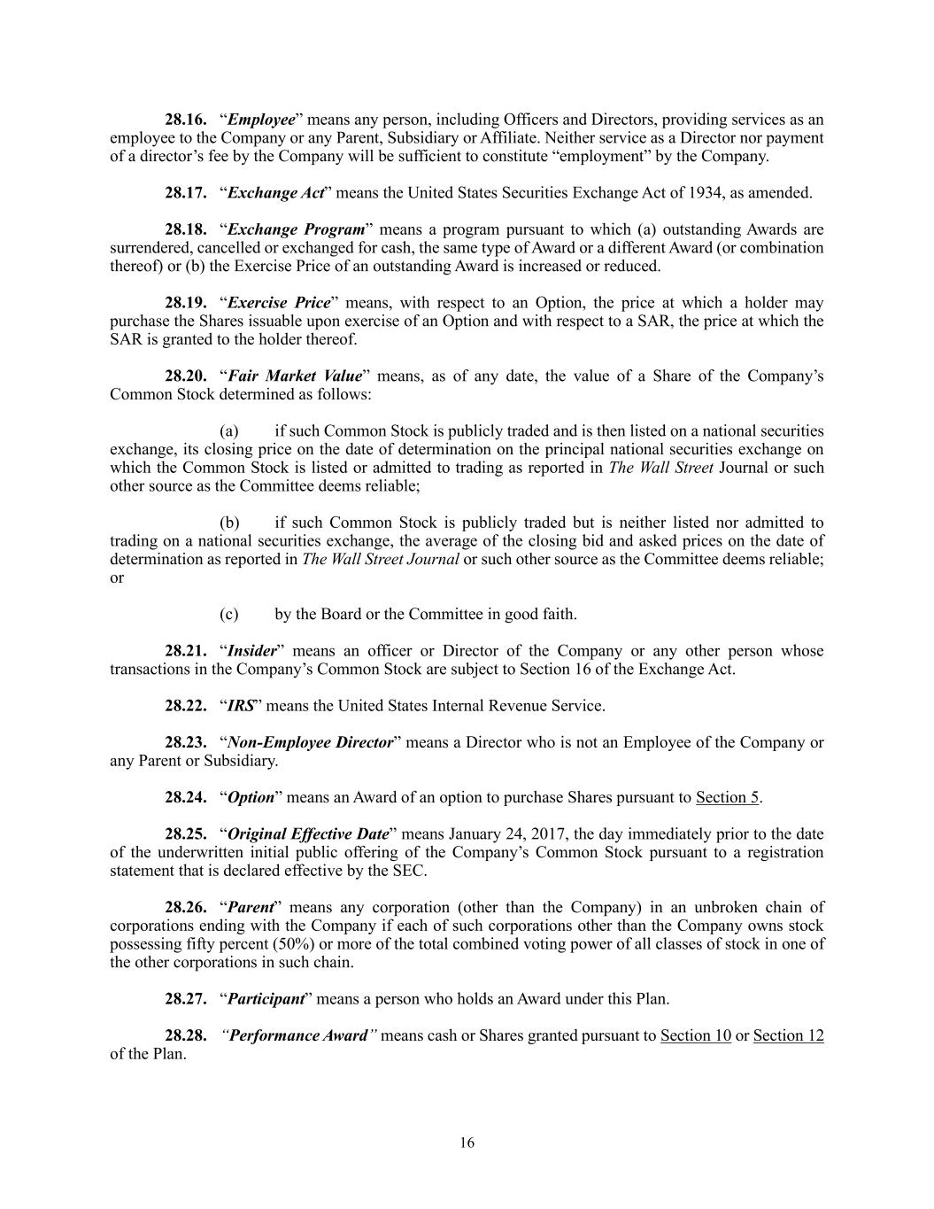 16 28.16. “Employee” means any person, including Officers and Directors, providing services as an employee to the Company or any Parent, Subsidiary or Affiliate. Neither service as a Director nor payment of a director’s fee by the Company will be sufficient to constitute “employment” by the Company. 28.17. “Exchange Act” means the United States Securities Exchange Act of 1934, as amended. 28.18. “Exchange Program” means a program pursuant to which (a) outstanding Awards are surrendered, cancelled or exchanged for cash, the same type of Award or a different Award (or combination thereof) or (b) the Exercise Price of an outstanding Award is increased or reduced. 28.19. “Exercise Price” means, with respect to an Option, the price at which a holder may purchase the Shares issuable upon exercise of an Option and with respect to a SAR, the price at which the SAR is granted to the holder thereof. 28.20. “Fair Market Value” means, as of any date, the value of a Share of the Company’s Common Stock determined as follows: (a) if such Common Stock is publicly traded and is then listed on a national securities exchange, its closing price on the date of determination on the principal national securities exchange on which the Common Stock is listed or admitted to trading as reported in The Wall Street Journal or such other source as the Committee deems reliable; (b) if such Common Stock is publicly traded but is neither listed nor admitted to trading on a national securities exchange, the average of the closing bid and asked prices on the date of determination as reported in The Wall Street Journal or such other source as the Committee deems reliable; or (c) by the Board or the Committee in good faith. 28.21. “Insider” means an officer or Director of the Company or any other person whose transactions in the Company’s Common Stock are subject to Section 16 of the Exchange Act. 28.22. “IRS” means the United States Internal Revenue Service. 28.23. “Non-Employee Director” means a Director who is not an Employee of the Company or any Parent or Subsidiary. 28.24. “Option” means an Award of an option to purchase Shares pursuant to Section 5. 28.25. “Original Effective Date” means January 24, 2017, the day immediately prior to the date of the underwritten initial public offering of the Company’s Common Stock pursuant to a registration statement that is declared effective by the SEC. 28.26. “Parent” means any corporation (other than the Company) in an unbroken chain of corporations ending with the Company if each of such corporations other than the Company owns stock possessing fifty percent (50%) or more of the total combined voting power of all classes of stock in one of the other corporations in such chain. 28.27. “Participant” means a person who holds an Award under this Plan. 28.28. “Performance Award” means cash or Shares granted pursuant to Section 10 or Section 12 of the Plan.