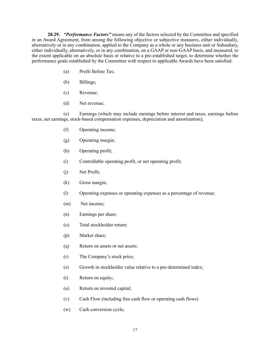 17 28.29. “Performance Factors” means any of the factors selected by the Committee and specified in an Award Agreement, from among the following objective or subjective measures, either individually, alternatively or in any combination, applied to the Company as a whole or any business unit or Subsidiary, either individually, alternatively, or in any combination, on a GAAP or non-GAAP basis, and measured, to the extent applicable on an absolute basis or relative to a pre-established target, to determine whether the performance goals established by the Committee with respect to applicable Awards have been satisfied: (a) Profit Before Tax; (b) Billings; (c) Revenue; (d) Net revenue; (e) Earnings (which may include earnings before interest and taxes, earnings before taxes, net earnings, stock-based compensation expenses, depreciation and amortization); (f) Operating income; (g) Operating margin; (h) Operating profit; (i) Controllable operating profit, or net operating profit; (j) Net Profit; (k) Gross margin; (l) Operating expenses or operating expenses as a percentage of revenue; (m) Net income; (n) Earnings per share; (o) Total stockholder return; (p) Market share; (q) Return on assets or net assets; (r) The Company’s stock price; (s) Growth in stockholder value relative to a pre-determined index; (t) Return on equity; (u) Return on invested capital; (v) Cash Flow (including free cash flow or operating cash flows) (w) Cash conversion cycle;