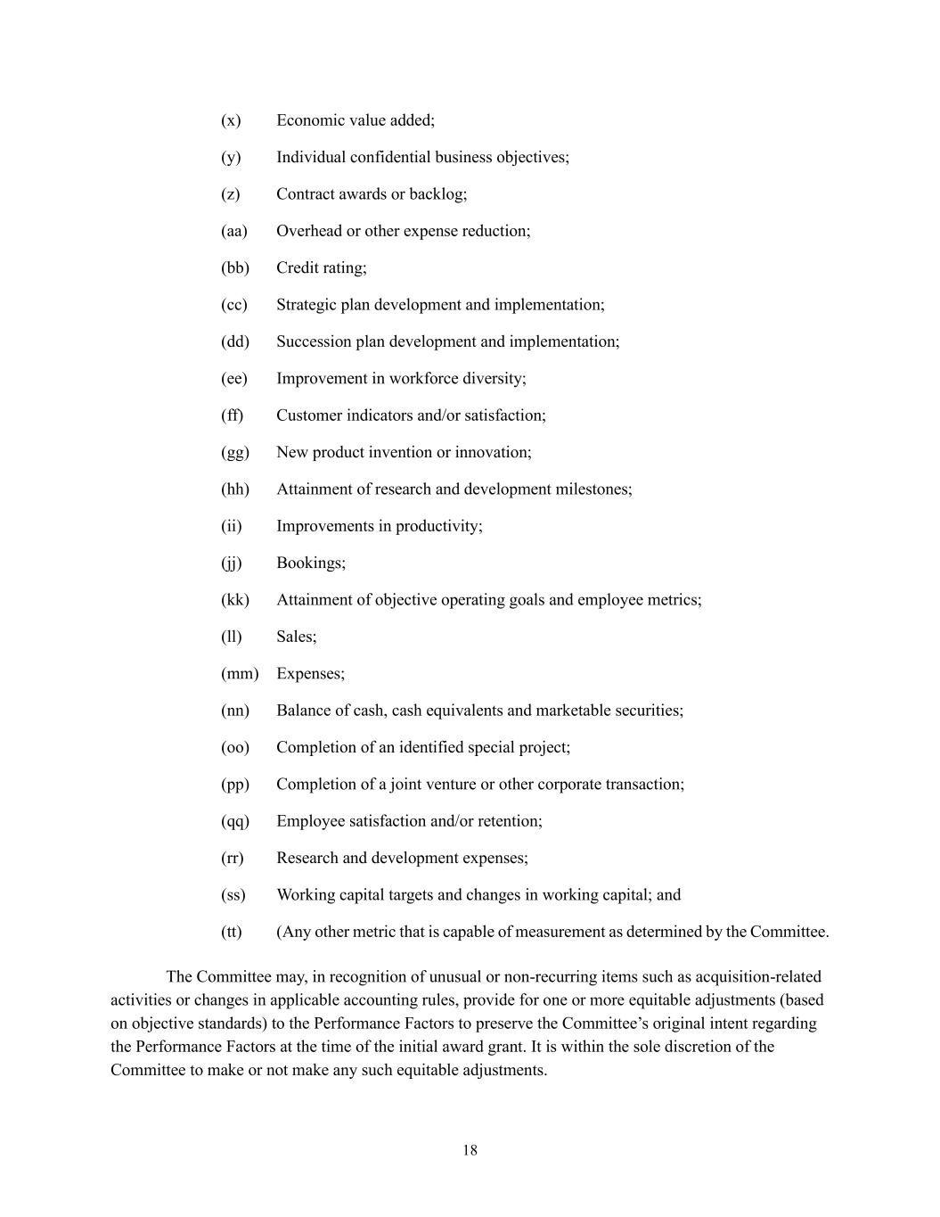 18 (x) Economic value added; (y) Individual confidential business objectives; (z) Contract awards or backlog; (aa) Overhead or other expense reduction; (bb) Credit rating; (cc) Strategic plan development and implementation; (dd) Succession plan development and implementation; (ee) Improvement in workforce diversity; (ff) Customer indicators and/or satisfaction; (gg) New product invention or innovation; (hh) Attainment of research and development milestones; (ii) Improvements in productivity; (jj) Bookings; (kk) Attainment of objective operating goals and employee metrics; (ll) Sales; (mm) Expenses; (nn) Balance of cash, cash equivalents and marketable securities; (oo) Completion of an identified special project; (pp) Completion of a joint venture or other corporate transaction; (qq) Employee satisfaction and/or retention; (rr) Research and development expenses; (ss) Working capital targets and changes in working capital; and (tt) (Any other metric that is capable of measurement as determined by the Committee. The Committee may, in recognition of unusual or non-recurring items such as acquisition-related activities or changes in applicable accounting rules, provide for one or more equitable adjustments (based on objective standards) to the Performance Factors to preserve the Committee’s original intent regarding the Performance Factors at the time of the initial award grant. It is within the sole discretion of the Committee to make or not make any such equitable adjustments.