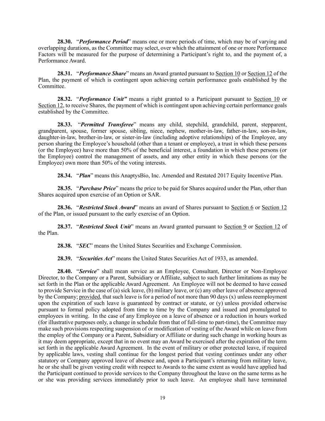 19 28.30. “Performance Period” means one or more periods of time, which may be of varying and overlapping durations, as the Committee may select, over which the attainment of one or more Performance Factors will be measured for the purpose of determining a Participant’s right to, and the payment of, a Performance Award. 28.31. “Performance Share” means an Award granted pursuant to Section 10 or Section 12 of the Plan, the payment of which is contingent upon achieving certain performance goals established by the Committee. 28.32. “Performance Unit” means a right granted to a Participant pursuant to Section 10 or Section 12, to receive Shares, the payment of which is contingent upon achieving certain performance goals established by the Committee. 28.33. “Permitted Transferee” means any child, stepchild, grandchild, parent, stepparent, grandparent, spouse, former spouse, sibling, niece, nephew, mother-in-law, father-in-law, son-in-law, daughter-in-law, brother-in-law, or sister-in-law (including adoptive relationships) of the Employee, any person sharing the Employee’s household (other than a tenant or employee), a trust in which these persons (or the Employee) have more than 50% of the beneficial interest, a foundation in which these persons (or the Employee) control the management of assets, and any other entity in which these persons (or the Employee) own more than 50% of the voting interests. 28.34. “Plan” means this AnaptysBio, Inc. Amended and Restated 2017 Equity Incentive Plan. 28.35. “Purchase Price” means the price to be paid for Shares acquired under the Plan, other than Shares acquired upon exercise of an Option or SAR. 28.36. “Restricted Stock Award” means an award of Shares pursuant to Section 6 or Section 12 of the Plan, or issued pursuant to the early exercise of an Option. 28.37. “Restricted Stock Unit” means an Award granted pursuant to Section 9 or Section 12 of the Plan. 28.38. “SEC” means the United States Securities and Exchange Commission. 28.39. “Securities Act” means the United States Securities Act of 1933, as amended. 28.40. “Service” shall mean service as an Employee, Consultant, Director or Non-Employee Director, to the Company or a Parent, Subsidiary or Affiliate, subject to such further limitations as may be set forth in the Plan or the applicable Award Agreement. An Employee will not be deemed to have ceased to provide Service in the case of (a) sick leave, (b) military leave, or (c) any other leave of absence approved by the Company; provided, that such leave is for a period of not more than 90 days (x) unless reemployment upon the expiration of such leave is guaranteed by contract or statute, or (y) unless provided otherwise pursuant to formal policy adopted from time to time by the Company and issued and promulgated to employees in writing. In the case of any Employee on a leave of absence or a reduction in hours worked (for illustrative purposes only, a change in schedule from that of full-time to part-time), the Committee may make such provisions respecting suspension of or modification of vesting of the Award while on leave from the employ of the Company or a Parent, Subsidiary or Affiliate or during such change in working hours as it may deem appropriate, except that in no event may an Award be exercised after the expiration of the term set forth in the applicable Award Agreement. In the event of military or other protected leave, if required by applicable laws, vesting shall continue for the longest period that vesting continues under any other statutory or Company approved leave of absence and, upon a Participant’s returning from military leave, he or she shall be given vesting credit with respect to Awards to the same extent as would have applied had the Participant continued to provide services to the Company throughout the leave on the same terms as he or she was providing services immediately prior to such leave. An employee shall have terminated