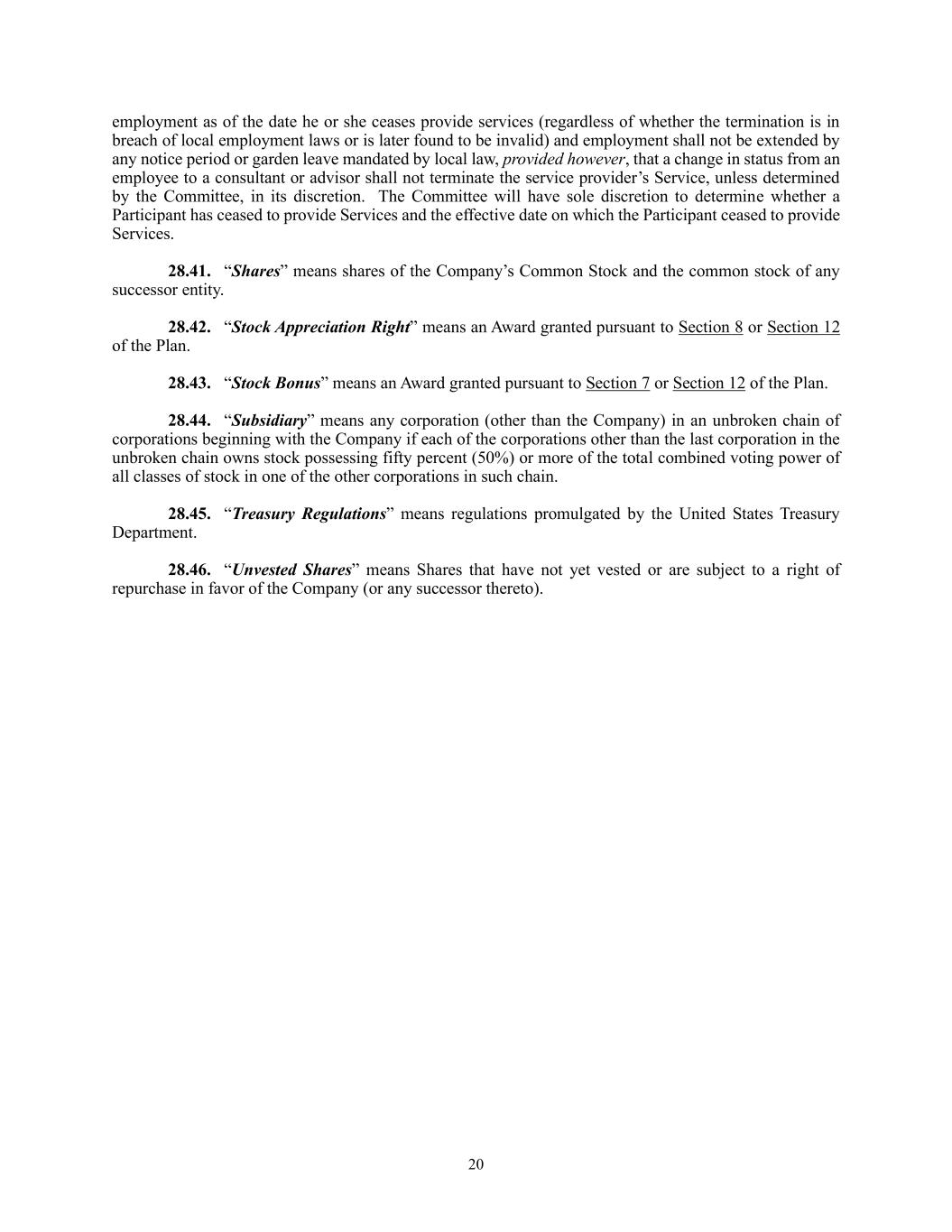 20 employment as of the date he or she ceases provide services (regardless of whether the termination is in breach of local employment laws or is later found to be invalid) and employment shall not be extended by any notice period or garden leave mandated by local law, provided however, that a change in status from an employee to a consultant or advisor shall not terminate the service provider’s Service, unless determined by the Committee, in its discretion. The Committee will have sole discretion to determine whether a Participant has ceased to provide Services and the effective date on which the Participant ceased to provide Services. 28.41. “Shares” means shares of the Company’s Common Stock and the common stock of any successor entity. 28.42. “Stock Appreciation Right” means an Award granted pursuant to Section 8 or Section 12 of the Plan. 28.43. “Stock Bonus” means an Award granted pursuant to Section 7 or Section 12 of the Plan. 28.44. “Subsidiary” means any corporation (other than the Company) in an unbroken chain of corporations beginning with the Company if each of the corporations other than the last corporation in the unbroken chain owns stock possessing fifty percent (50%) or more of the total combined voting power of all classes of stock in one of the other corporations in such chain. 28.45. “Treasury Regulations” means regulations promulgated by the United States Treasury Department. 28.46. “Unvested Shares” means Shares that have not yet vested or are subject to a right of repurchase in favor of the Company (or any successor thereto).