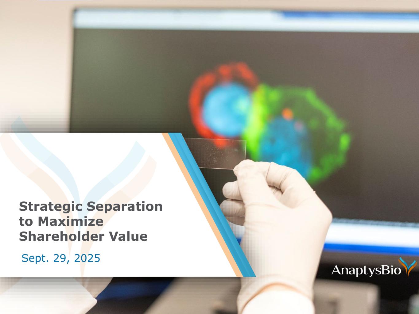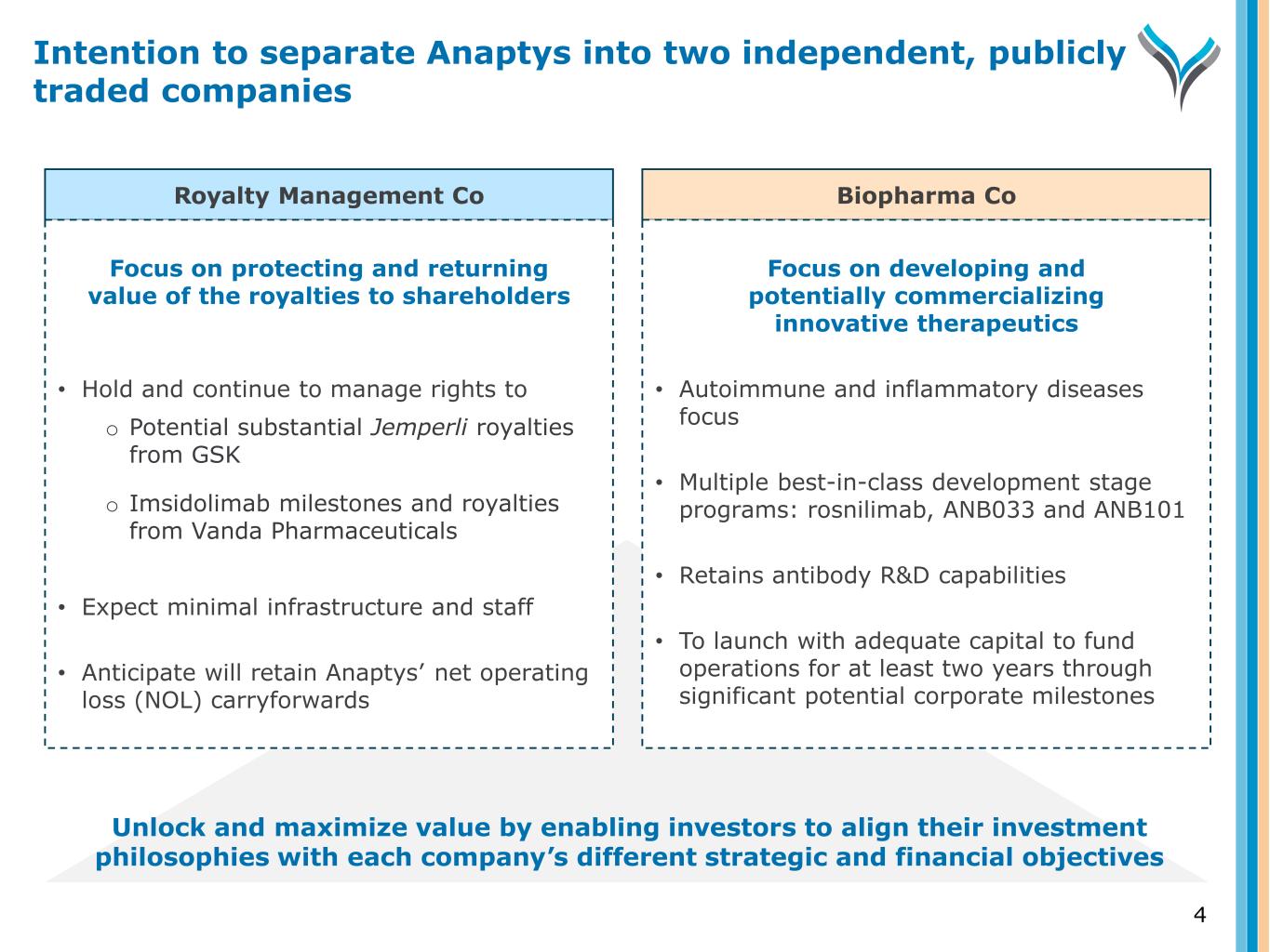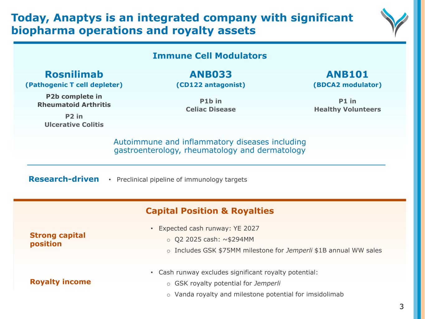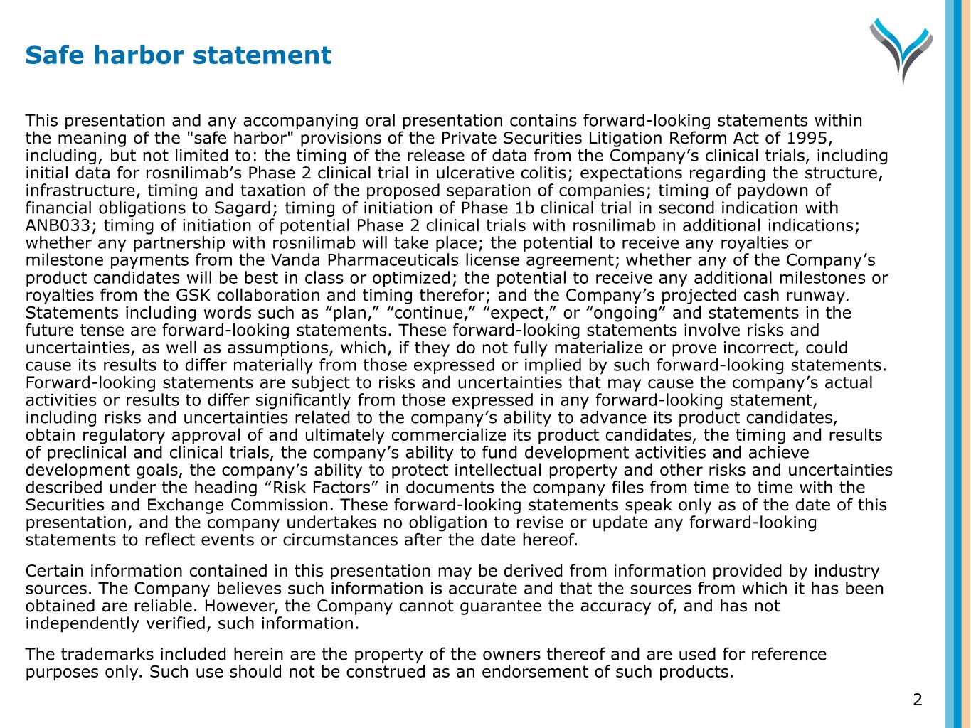 This presentation and any accompanying oral presentation contains forward-looking statements within the meaning of the "safe harbor" provisions of the Private Securities Litigation Reform Act of 1995, including, but not limited to: the timing of the release of data from the Company’s clinical trials, including initial data for rosnilimab’s Phase 2 clinical trial in ulcerative colitis; expectations regarding the structure, infrastructure, timing and taxation of the proposed separation of companies; timing of paydown of financial obligations to Sagard; timing of initiation of Phase 1b clinical trial in second indication with ANB033; timing of initiation of potential Phase 2 clinical trials with rosnilimab in additional indications; whether any partnership with rosnilimab will take place; the potential to receive any royalties or milestone payments from the Vanda Pharmaceuticals license agreement; whether any of the Company’s product candidates will be best in class or optimized; the potential to receive any additional milestones or royalties from the GSK collaboration and timing therefor; and the Company’s projected cash runway. Statements including words such as “plan,” “continue,” “expect,” or “ongoing” and statements in the future tense are forward-looking statements. These forward-looking statements involve risks and uncertainties, as well as assumptions, which, if they do not fully materialize or prove incorrect, could cause its results to differ materially from those expressed or implied by such forward-looking statements. Forward-looking statements are subject to risks and uncertainties that may cause the company’s actual activities or results to differ significantly from those expressed in any forward-looking statement, including risks and uncertainties related to the company’s ability to advance its product candidates, obtain regulatory approval of and ultimately commercialize its product candidates, the timing and results of preclinical and clinical trials, the company’s ability to fund development activities and achieve development goals, the company’s ability to protect intellectual property and other risks and uncertainties described under the heading “Risk Factors” in documents the company files from time to time with the Securities and Exchange Commission. These forward-looking statements speak only as of the date of this presentation, and the company undertakes no obligation to revise or update any forward-looking statements to reflect events or circumstances after the date hereof. Certain information contained in this presentation may be derived from information provided by industry sources. The Company believes such information is accurate and that the sources from which it has been obtained are reliable. However, the Company cannot guarantee the accuracy of, and has not independently verified, such information. The trademarks included herein are the property of the owners thereof and are used for reference purposes only. Such use should not be construed as an endorsement of such products. 2 Safe harbor statement