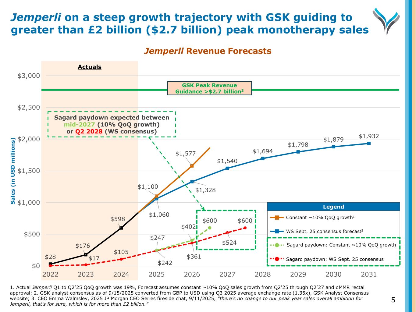 Actuals 1. Actual Jemperli Q1 to Q2’25 QoQ growth was 19%, Forecast assumes constant ~10% QoQ sales growth from Q2’25 through Q2’27 and dMMR rectal approval; 2. GSK analyst consensus as of 9/15/2025 converted from GBP to USD using Q3 2025 average exchange rate (1.35x), GSK Analyst Consensus website; 3. CEO Emma Walmsley, 2025 JP Morgan CEO Series fireside chat, 9/11/2025, “there's no change to our peak year sales overall ambition for Jemperli, that's for sure, which is for more than £2 billion.” Jemperli on a steep growth trajectory with GSK guiding to greater than £2 billion ($2.7 billion) peak monotherapy sales 5 Jemperli Revenue Forecasts $28 $176 $598 $1,060 $1,328 $1,540 $1,694 $1,798 $1,879 $1,932 $17 $105 $242 $361 $524 $600 $1,100 $1,577 $247 $402 $600 $0 $500 $1,000 $1,500 $2,000 $2,500 $3,000 2022 2023 2024 2025 2026 2027 2028 2029 2030 2031 S a le s (i n U S D m il li o n s) Legend Legend Constant ~10% QoQ growth1 WS Sept. 25 consensus forecast2 Sagard paydown: Constant ~10% QoQ growth Sagard paydown: WS Sept. 25 consensus Sagard paydown expected between mid-2027 (10% QoQ growth) or Q2 2028 (WS consensus) GSK Peak Revenue Guidance >$2.7 billion3