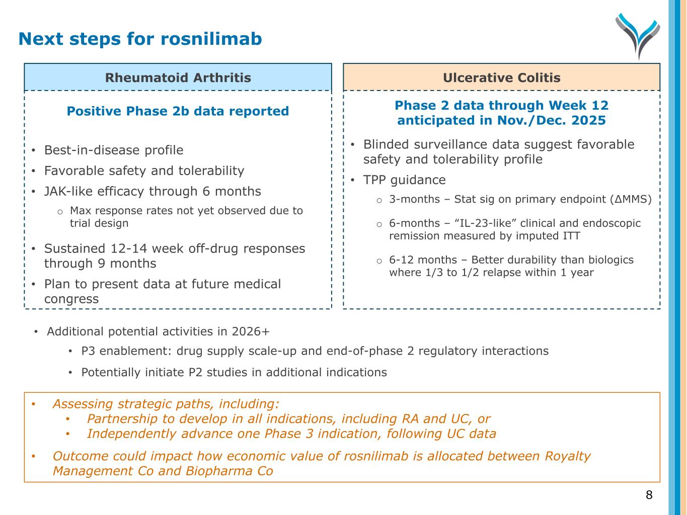 Rheumatoid Arthritis Ulcerative Colitis Positive Phase 2b data reported • Best-in-disease profile • Favorable safety and tolerability • JAK-like efficacy through 6 months o Max response rates not yet observed due to trial design • Sustained 12-14 week off-drug responses through 9 months • Plan to present data at future medical congress Phase 2 data through Week 12 anticipated in Nov./Dec. 2025 • Blinded surveillance data suggest favorable safety and tolerability profile • TPP guidance o 3-months – Stat sig on primary endpoint (∆MMS) o 6-months – “IL-23-like” clinical and endoscopic remission measured by imputed ITT o 6-12 months – Better durability than biologics where 1/3 to 1/2 relapse within 1 year • Additional potential activities in 2026+ • P3 enablement: drug supply scale-up and end-of-phase 2 regulatory interactions • Potentially initiate P2 studies in additional indications Next steps for rosnilimab 8 • Assessing strategic paths, including: • Partnership to develop in all indications, including RA and UC, or • Independently advance one Phase 3 indication, following UC data • Outcome could impact how economic value of rosnilimab is allocated between Royalty Management Co and Biopharma Co