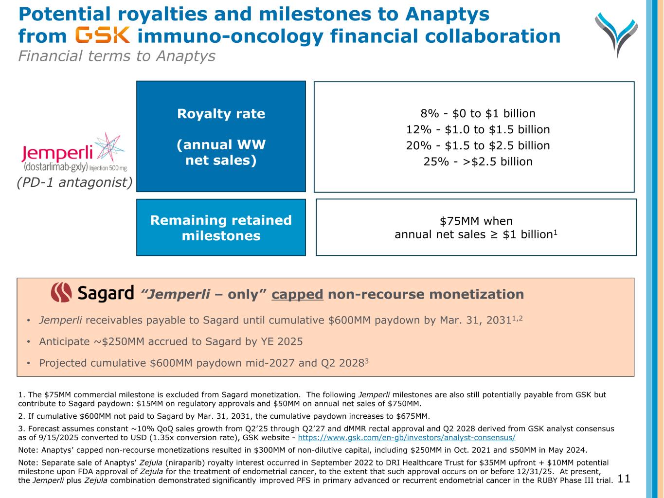 “Jemperli – only” capped non-recourse monetization • Jemperli receivables payable to Sagard until cumulative $600MM paydown by Mar. 31, 20311,2 • Anticipate ~$250MM accrued to Sagard by YE 2025 • Projected cumulative $600MM paydown mid-2027 and Q2 20283 Potential royalties and milestones to Anaptys from immuno-oncology financial collaboration Financial terms to Anaptys 11 1. The $75MM commercial milestone is excluded from Sagard monetization. The following Jemperli milestones are also still potentially payable from GSK but contribute to Sagard paydown: $15MM on regulatory approvals and $50MM on annual net sales of $750MM. 2. If cumulative $600MM not paid to Sagard by Mar. 31, 2031, the cumulative paydown increases to $675MM. 3. Forecast assumes constant ~10% QoQ sales growth from Q2’25 through Q2’27 and dMMR rectal approval and Q2 2028 derived from GSK analyst consensus as of 9/15/2025 converted to USD (1.35x conversion rate), GSK website - https://www.gsk.com/en-gb/investors/analyst-consensus/ Note: Anaptys’ capped non-recourse monetizations resulted in $300MM of non-dilutive capital, including $250MM in Oct. 2021 and $50MM in May 2024. Note: Separate sale of Anaptys’ Zejula (niraparib) royalty interest occurred in September 2022 to DRI Healthcare Trust for $35MM upfront + $10MM potential milestone upon FDA approval of Zejula for the treatment of endometrial cancer, to the extent that such approval occurs on or before 12/31/25. At present, the Jemperli plus Zejula combination demonstrated significantly improved PFS in primary advanced or recurrent endometrial cancer in the RUBY Phase III trial. (PD-1 antagonist) Royalty rate (annual WW net sales) Remaining retained milestones 8% - $0 to $1 billion 12% - $1.0 to $1.5 billion 20% - $1.5 to $2.5 billion 25% - >$2.5 billion $75MM when annual net sales ≥ $1 billion1