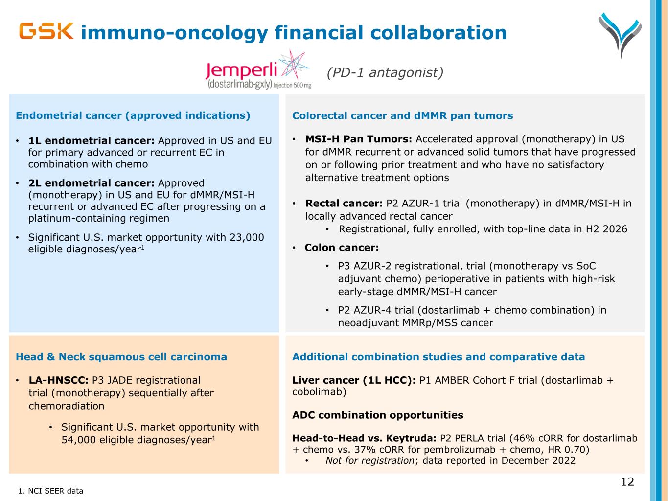 Head & Neck squamous cell carcinoma • LA-HNSCC: P3 JADE registrational trial (monotherapy) sequentially after chemoradiation • Significant U.S. market opportunity with 54,000 eligible diagnoses/year1 immuno-oncology financial collaboration Colorectal cancer and dMMR pan tumors • MSI-H Pan Tumors: Accelerated approval (monotherapy) in US for dMMR recurrent or advanced solid tumors that have progressed on or following prior treatment and who have no satisfactory alternative treatment options • Rectal cancer: P2 AZUR-1 trial (monotherapy) in dMMR/MSI-H in locally advanced rectal cancer • Registrational, fully enrolled, with top-line data in H2 2026 • Colon cancer: • P3 AZUR-2 registrational, trial (monotherapy vs SoC adjuvant chemo) perioperative in patients with high-risk early-stage dMMR/MSI-H cancer • P2 AZUR-4 trial (dostarlimab + chemo combination) in neoadjuvant MMRp/MSS cancer 1. NCI SEER data 12 Endometrial cancer (approved indications) • 1L endometrial cancer: Approved in US and EU for primary advanced or recurrent EC in combination with chemo • 2L endometrial cancer: Approved (monotherapy) in US and EU for dMMR/MSI-H recurrent or advanced EC after progressing on a platinum-containing regimen • Significant U.S. market opportunity with 23,000 eligible diagnoses/year1 (PD-1 antagonist) Additional combination studies and comparative data Liver cancer (1L HCC): P1 AMBER Cohort F trial (dostarlimab + cobolimab) ADC combination opportunities Head-to-Head vs. Keytruda: P2 PERLA trial (46% cORR for dostarlimab + chemo vs. 37% cORR for pembrolizumab + chemo, HR 0.70) • Not for registration; data reported in December 2022