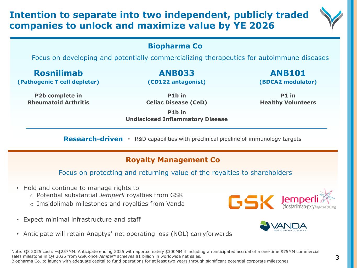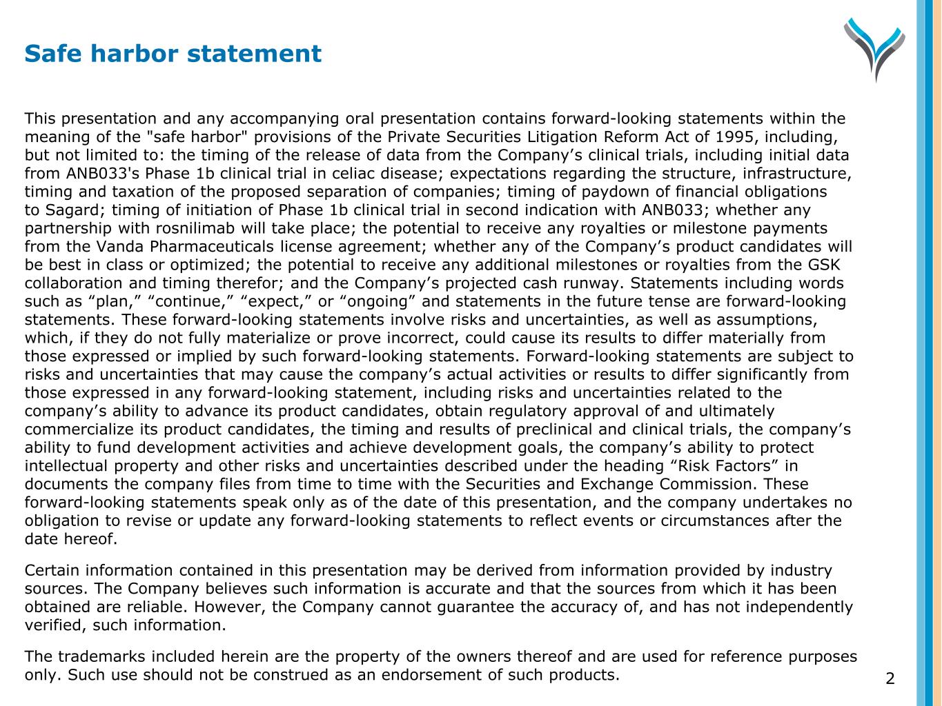 This presentation and any accompanying oral presentation contains forward-looking statements within the meaning of the "safe harbor" provisions of the Private Securities Litigation Reform Act of 1995, including, but not limited to: the timing of the release of data from the Company’s clinical trials, including initial data from ANB033's Phase 1b clinical trial in celiac disease; expectations regarding the structure, infrastructure, timing and taxation of the proposed separation of companies; timing of paydown of financial obligations to Sagard; timing of initiation of Phase 1b clinical trial in second indication with ANB033; whether any partnership with rosnilimab will take place; the potential to receive any royalties or milestone payments from the Vanda Pharmaceuticals license agreement; whether any of the Company’s product candidates will be best in class or optimized; the potential to receive any additional milestones or royalties from the GSK collaboration and timing therefor; and the Company’s projected cash runway. Statements including words such as “plan,” “continue,” “expect,” or “ongoing” and statements in the future tense are forward-looking statements. These forward-looking statements involve risks and uncertainties, as well as assumptions, which, if they do not fully materialize or prove incorrect, could cause its results to differ materially from those expressed or implied by such forward-looking statements. Forward-looking statements are subject to risks and uncertainties that may cause the company’s actual activities or results to differ significantly from those expressed in any forward-looking statement, including risks and uncertainties related to the company’s ability to advance its product candidates, obtain regulatory approval of and ultimately commercialize its product candidates, the timing and results of preclinical and clinical trials, the company’s ability to fund development activities and achieve development goals, the company’s ability to protect intellectual property and other risks and uncertainties described under the heading “Risk Factors” in documents the company files from time to time with the Securities and Exchange Commission. These forward-looking statements speak only as of the date of this presentation, and the company undertakes no obligation to revise or update any forward-looking statements to reflect events or circumstances after the date hereof. Certain information contained in this presentation may be derived from information provided by industry sources. The Company believes such information is accurate and that the sources from which it has been obtained are reliable. However, the Company cannot guarantee the accuracy of, and has not independently verified, such information. The trademarks included herein are the property of the owners thereof and are used for reference purposes only. Such use should not be construed as an endorsement of such products. 2 Safe harbor statement
