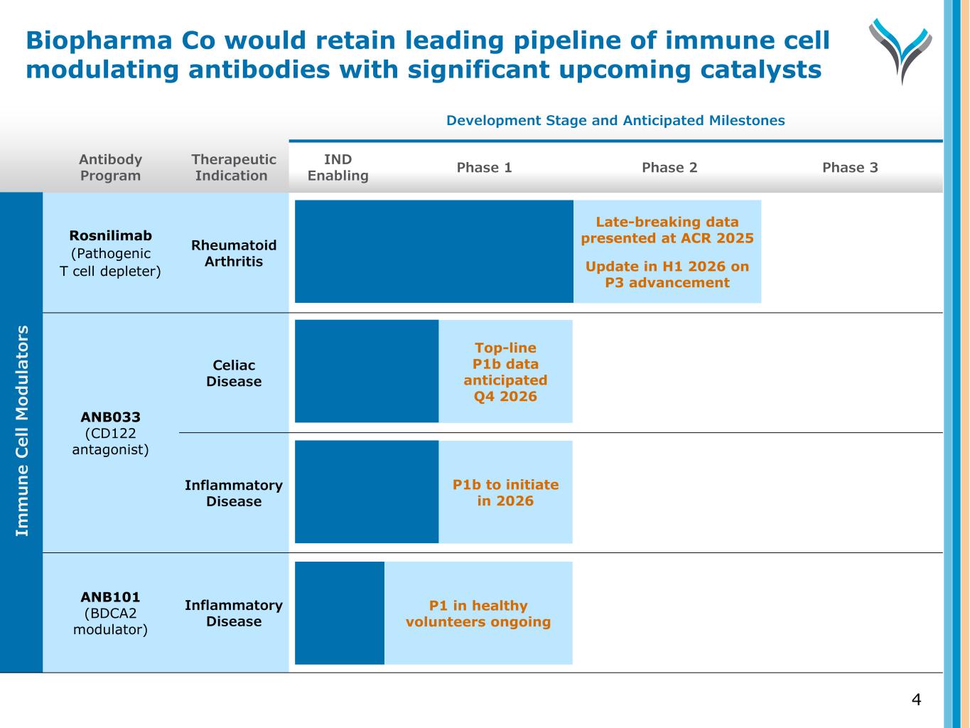 Biopharma Co ANB033 (CD122 antagonist) P1b in Celiac Disease (CeD) P1b in Undisclosed Inflammatory Disease Rosnilimab (Pathogenic T cell depleter) P2b complete in Rheumatoid Arthritis Focus on developing and potentially commercializing therapeutics for autoimmune diseases ANB101 (BDCA2 modulator) P1 in Healthy Volunteers Royalty Management Co 3 Research-driven • R&D capabilities with preclinical pipeline of immunology targets Note: Q3 2025 cash: ~$257MM. Anticipate ending 2025 with approximately $300MM if including an anticipated accrual of a one-time $75MM commercial sales milestone in Q4 2025 from GSK once Jemperli achieves $1 billion in worldwide net sales. Biopharma Co. to launch with adequate capital to fund operations for at least two years through significant potential corporate milestones Focus on protecting and returning value of the royalties to shareholders • Hold and continue to manage rights to o Potential substantial Jemperli royalties from GSK o Imsidolimab milestones and royalties from Vanda • Expect minimal infrastructure and staff • Anticipate will retain Anaptys’ net operating loss (NOL) carryforwards Intention to separate into two independent, publicly traded companies to unlock and maximize value by YE 2026