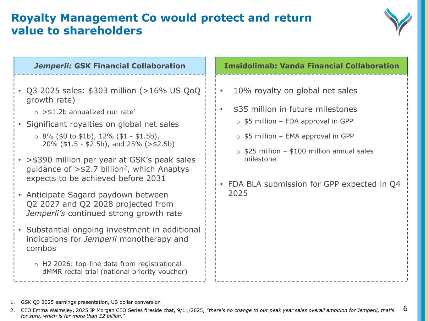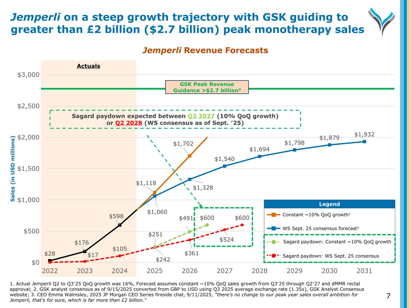 6 Jemperli: GSK Financial Collaboration Imsidolimab: Vanda Financial Collaboration • Q3 2025 sales: $303 million (>16% US QoQ growth rate) o >$1.2b annualized run rate1 • Significant royalties on global net sales o 8% ($0 to $1b), 12% ($1 - $1.5b), 20% ($1.5 - $2.5b), and 25% (>$2.5b) • >$390 million per year at GSK’s peak sales guidance of >$2.7 billion2, which Anaptys expects to be achieved before 2031 • Anticipate Sagard paydown between Q2 2027 and Q2 2028 projected from Jemperli’s continued strong growth rate • Substantial ongoing investment in additional indications for Jemperli monotherapy and combos o H2 2026: top-line data from registrational dMMR rectal trial (national priority voucher) • 10% royalty on global net sales • $35 million in future milestones o $5 million – FDA approval in GPP o $5 million – EMA approval in GPP o $25 million – $100 million annual sales milestone • FDA BLA submission for GPP expected in Q4 2025 1. GSK Q3 2025 earnings presentation, US dollar conversion 2. CEO Emma Walmsley, 2025 JP Morgan CEO Series fireside chat, 9/11/2025, “there's no change to our peak year sales overall ambition for Jemperli, that's for sure, which is far more than £2 billion.” Royalty Management Co would protect and return value to shareholders