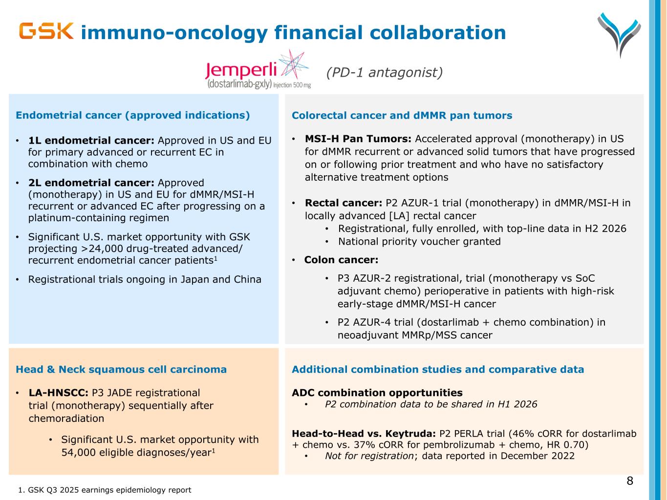 Head & Neck squamous cell carcinoma • LA-HNSCC: P3 JADE registrational trial (monotherapy) sequentially after chemoradiation • Significant U.S. market opportunity with 54,000 eligible diagnoses/year1 immuno-oncology financial collaboration Colorectal cancer and dMMR pan tumors • MSI-H Pan Tumors: Accelerated approval (monotherapy) in US for dMMR recurrent or advanced solid tumors that have progressed on or following prior treatment and who have no satisfactory alternative treatment options • Rectal cancer: P2 AZUR-1 trial (monotherapy) in dMMR/MSI-H in locally advanced [LA] rectal cancer • Registrational, fully enrolled, with top-line data in H2 2026 • National priority voucher granted • Colon cancer: • P3 AZUR-2 registrational, trial (monotherapy vs SoC adjuvant chemo) perioperative in patients with high-risk early-stage dMMR/MSI-H cancer • P2 AZUR-4 trial (dostarlimab + chemo combination) in neoadjuvant MMRp/MSS cancer 1. GSK Q3 2025 earnings epidemiology report 8 Endometrial cancer (approved indications) • 1L endometrial cancer: Approved in US and EU for primary advanced or recurrent EC in combination with chemo • 2L endometrial cancer: Approved (monotherapy) in US and EU for dMMR/MSI-H recurrent or advanced EC after progressing on a platinum-containing regimen • Significant U.S. market opportunity with GSK projecting >24,000 drug-treated advanced/ recurrent endometrial cancer patients1 • Registrational trials ongoing in Japan and China (PD-1 antagonist) Additional combination studies and comparative data ADC combination opportunities • P2 combination data to be shared in H1 2026 Head-to-Head vs. Keytruda: P2 PERLA trial (46% cORR for dostarlimab + chemo vs. 37% cORR for pembrolizumab + chemo, HR 0.70) • Not for registration; data reported in December 2022