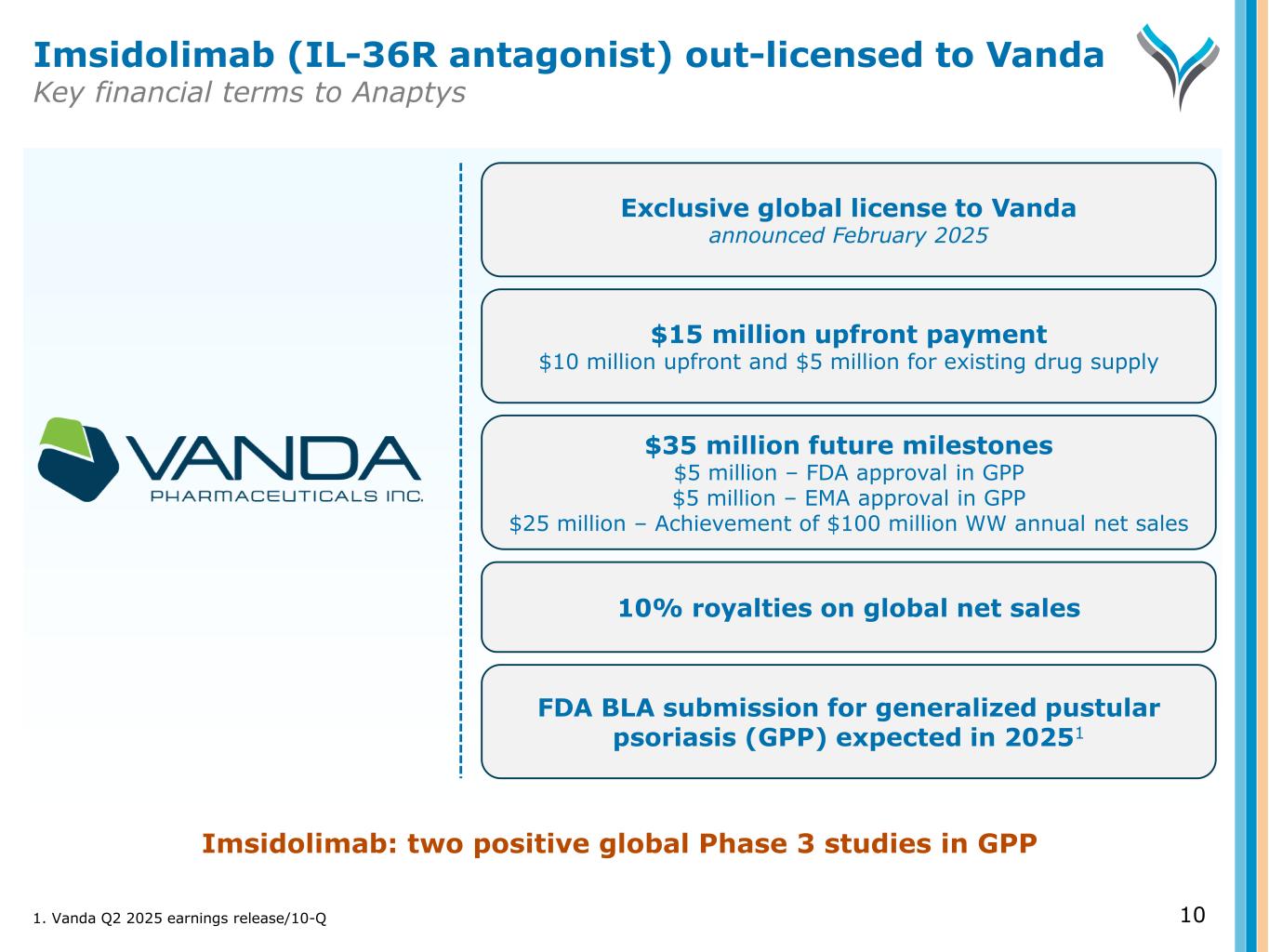 “Jemperli – only” capped non-recourse monetization • Jemperli receivables payable to Sagard until cumulative $600MM paydown by Mar. 31, 20311,2 • Anticipate ~$250MM accrued to Sagard by YE 2025 • Projected cumulative $600MM paydown mid-2027 and Q2 20283 Potential royalties and milestones to Anaptys from immuno-oncology financial collaboration 9 1. The $75MM commercial milestone is excluded from Sagard monetization. The following Jemperli milestones are also still potentially payable from GSK but contribute to Sagard paydown: $15MM on regulatory approvals 2. If cumulative $600MM not paid to Sagard by Mar. 31, 2031, the cumulative paydown increases to $675MM. 3. Forecast assumes constant ~10% QoQ sales growth from Q3’25 through Q2’27 and dMMR rectal approval and Q2 2028 derived from GSK analyst consensus as of 9/15/2025 converted to USD (1.35x conversion rate), GSK website - https://www.gsk.com/en-gb/investors/analyst-consensus/ Note: Anaptys’ capped non-recourse monetizations resulted in $300MM of non-dilutive capital, including $250MM in Oct. 2021 and $50MM in May 2024. Note: Separate sale of Anaptys’ Zejula (niraparib) royalty interest occurred in September 2022 to DRI Healthcare Trust for $35MM upfront + $10MM potential milestone upon FDA approval of Zejula for the treatment of endometrial cancer, to the extent that such approval occurs on or before 12/31/25. At present, the Jemperli plus Zejula combination demonstrated significantly improved PFS in primary advanced or recurrent endometrial cancer in the RUBY Phase III trial. (PD-1 antagonist) Royalty rate (annual WW net sales) Remaining retained milestones 8% - $0 to $1 billion 12% - $1.0 to $1.5 billion 20% - $1.5 to $2.5 billion 25% - >$2.5 billion $75MM when annual net sales ≥ $1 billion1