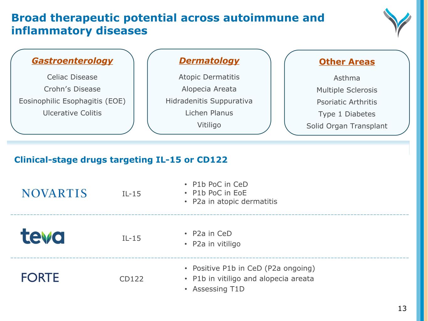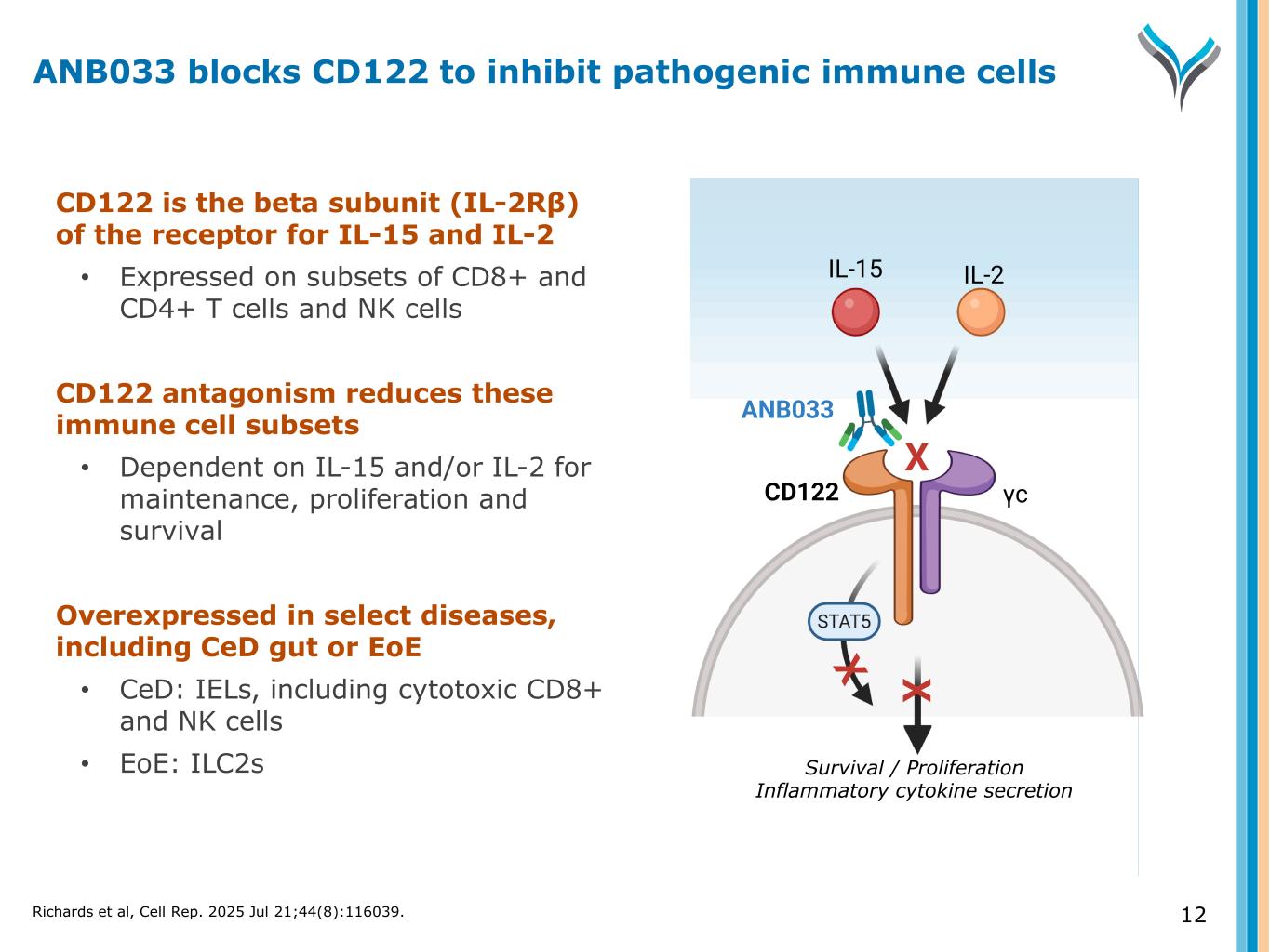 12 CD122 is the beta subunit (IL-2Rβ) of the receptor for IL-15 and IL-2 • Expressed on subsets of CD8+ and CD4+ T cells and NK cells CD122 antagonism reduces these immune cell subsets • Dependent on IL-15 and/or IL-2 for maintenance, proliferation and survival Overexpressed in select diseases, including CeD gut or EoE • CeD: IELs, including cytotoxic CD8+ and NK cells • EoE: ILC2s Survival / Proliferation Inflammatory cytokine secretion CD122 γc IL-15 IL-2 ANB033 X X ANB033 blocks CD122 to inhibit pathogenic immune cells Richards et al, Cell Rep. 2025 Jul 21;44(8):116039.