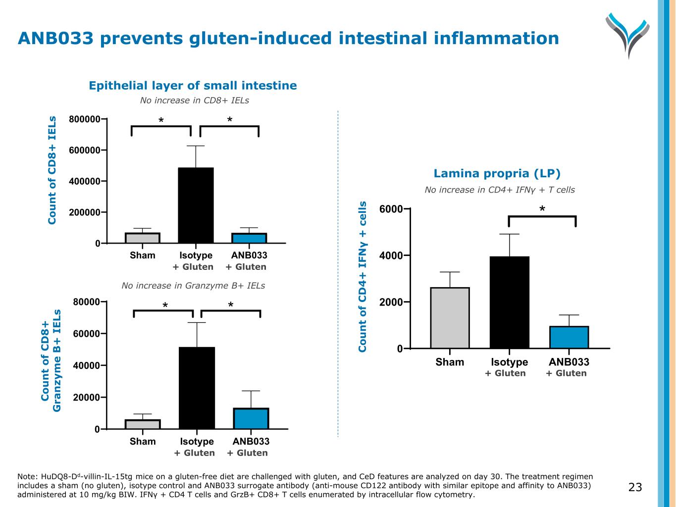 22 Healthy tissue: High villus height, lower crypt depth CeD tissue: Reduced villus height, extended crypt depth ANB033 impact on Vh:Cd ratio Sham Isotype ANB033 1 2 3 * * V h :C d R a ti o Vh:Cd ratio ANB033 significantly prevents reduction of Vh:Cd ratio compared to control ANB033 treatment shows improved histology: preserves villus height and crypt depth (Vh:Cd) in CeD mouse model Note: HuDQ8-Dd-villin-IL-15tg mice on a gluten-free diet are challenged with gluten, and CeD features are analyzed on day 30. The treatment regimen includes a sham (no gluten), isotype control and ANB033 surrogate antibody (anti-mouse CD122 antibody with similar epitope and affinity to ANB033) administered at 10 mg/kg BIW. * p<0.05. + Gluten + Gluten