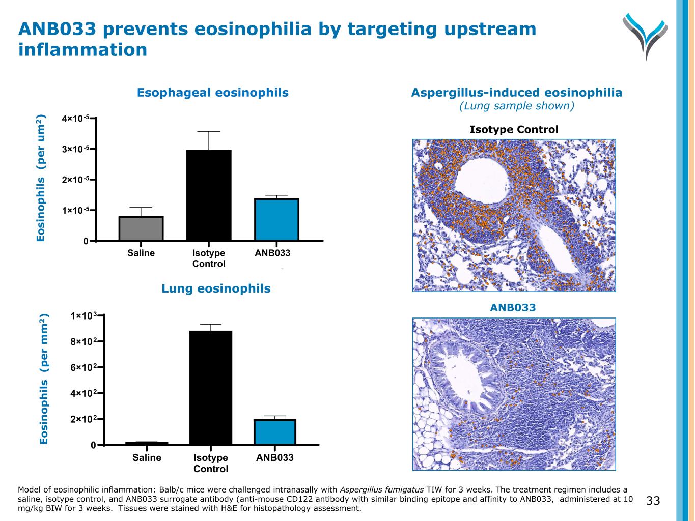 33 E o si n o p h il s ( p e r u m 2 ) Saline Isotype Control ANB033 Surrogate 0 1×10-5 2×10-5 3×10-5 4×10-5 Lung eosinophils E o si n o p h il s ( p e r m m 2 ) Saline Isotype Control ANB033 Surrogate 0 2×102 4×102 6×102 8×102 1×103 Esophageal eosinophils ANB033 prevents eosinophilia by targeting upstream inflammation Model of eosinophilic inflammation: Balb/c mice were challenged intranasally with Aspergillus fumigatus TIW for 3 weeks. The treatment regimen includes a saline, isotype control, and ANB033 surrogate antibody (anti-mouse CD122 antibody with similar binding epitope and affinity to ANB033, administered at 10 mg/kg BIW for 3 weeks. Tissues were stained with H&E for histopathology assessment. Aspergillus-induced eosinophilia (Lung sample shown) Isotype Control ANB033