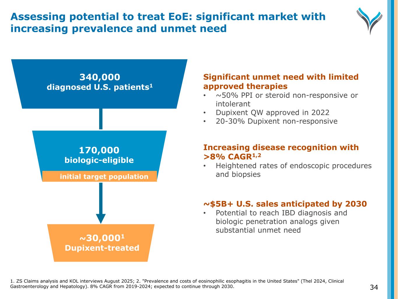 34 340,000 diagnosed U.S. patients1 Diagnosed 170,000 biologic-eligible ~30,0001 Dupixent-treated Significant unmet need with limited approved therapies • ~50% PPI or steroid non-responsive or intolerant • Dupixent QW approved in 2022 • 20-30% Dupixent non-responsive Increasing disease recognition with >8% CAGR1,2 • Heightened rates of endoscopic procedures and biopsies ~$5B+ U.S. sales anticipated by 2030 • Potential to reach IBD diagnosis and biologic penetration analogs given substantial unmet need Assessing potential to treat EoE: significant market with increasing prevalence and unmet need initial target population 1. ZS Claims analysis and KOL interviews August 2025; 2. "Prevalence and costs of eosinophilic esophagitis in the United States" (Thel 2024, Clinical Gastroenterology and Hepatology). 8% CAGR from 2019-2024; expected to continue through 2030.