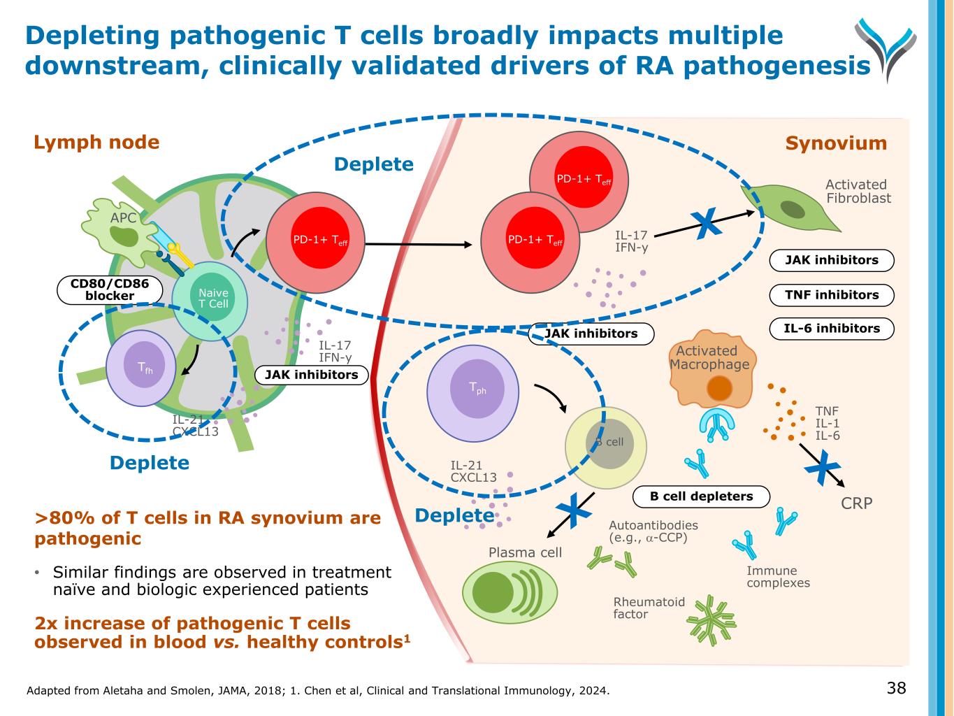 Adapted from Aletaha and Smolen, JAMA, 2018; 1. Chen et al, Clinical and Translational Immunology, 2024. 38 Depleting pathogenic T cells broadly impacts multiple downstream, clinically validated drivers of RA pathogenesis >80% of T cells in RA synovium are pathogenic • Similar findings are observed in treatment naïve and biologic experienced patients 2x increase of pathogenic T cells observed in blood vs. healthy controls1 Naive T Cell IL-17 IFN-y IL-21 CXCL13 APC Tfh Lymph node CD80/CD86 blocker JAK inhibitors Synovium Tph Activated Macrophage Activated Fibroblast TNF IL-1 IL-6B cell IL-21 CXCL13 Plasma cell Autoantibodies (e.g., α-CCP) Immune complexes Rheumatoid factor B cell depleters IL-6 inhibitors TNF inhibitors JAK inhibitors JAK inhibitors IL-17 IFN-y PD-1+ Teff PD-1+ TeffPD-1+ Teff Deplete Deplete Deplete CRP