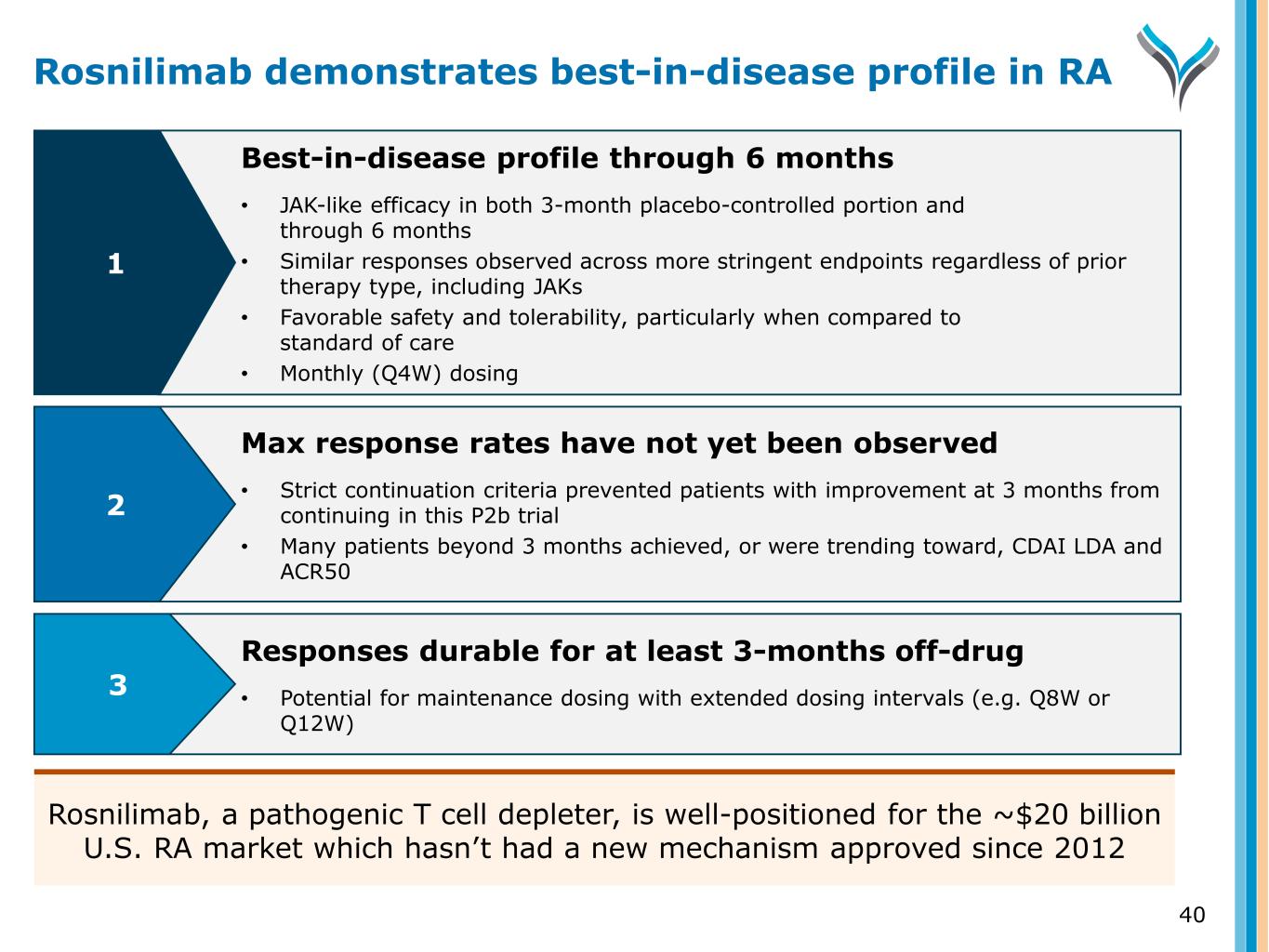 39 Screening Placebo SC (n=106) All-Active Off Drug Follow-Up Blinded Placebo- Controlled Treatment Blinded All-Active Treatment Rosnilimab SC 100mg Q4W (n=106) Rosnilimab SC 400mg Q4W (n=107) Rosnilimab SC 600mg Q2W (n=105) Rosnilimab SC 100mg Q4W (n=73) Rosnilimab SC 400mg Q4W (n=73) Rosnilimab SC 600mg Q2W (n=74) N=424 Randomized 1:1:1:1 On csDMARD Final Statistical Analysis Study Continuation Assessment (CDAI ≤10) Wk 14 Primary Statistical Analysis Wk12 Week -5 Week 0 Week 12 Week 14 Week 28 Week 38 End of Treatment Exit Rosnilimab Phase 2b trial in RA 95% completed 6-month all-active treatment period supporting rosnilimab's favorable efficacy and tolerability profile Key Inclusion Criteria – Seropositive RA, ≥6 swollen and ≥6 tender joints, hs-CRP ≥ 3mg/L during Screening, Concurrent use of 1 or 2 csDMARDs that were initiated at least 3 months before screening Key Exclusion Criteria – Inadequate response, loss of response, or intolerance to any combination of ≥ 3 b/tsDMARD classes Primary Endpoint - Mean change from baseline at Week 12 for DAS28-CRP