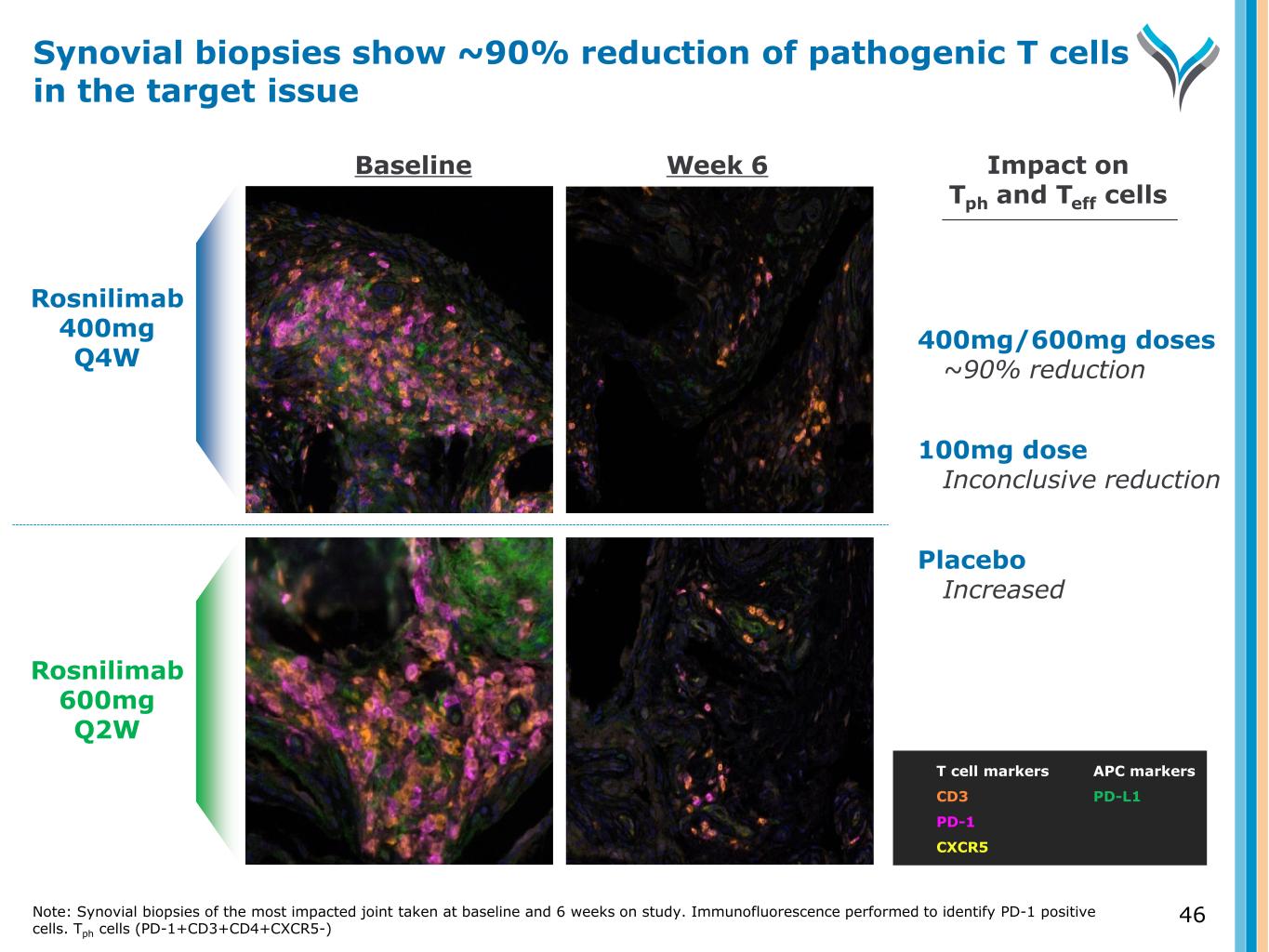 Wk0 Wk6 Wk12 Wk28 Wk38 (12-wk off-drug) -100% -75% -50% -25% 0% 25% 50% 75% 100% C el l C o u n t (% C h a n g e fr o m B a se li n e) Rosnilimab 400mg Q4W T Cell Impact Rosnilimab Tph Impact – Pooled Doses Rosnilimab 600mg Q2W T Cell Impact Rosnilimab 100mg Q4W T Cell Impact -100% -75% -50% -25% 0% 25% 50% 75% 100% C el l C o u n t (% C h a n g e fr o m B a se li n e) Wk0 Wk6 Wk12 Wk28 Wk38 (14-wk off-drug) -100% -75% -50% -25% 0% 25% 50% 75% 100% C el l C o u n t (% C h a n g e fr o m B a se li n e) 45 Deep, sustained reduction of pathogenic T cells led to favorable T cell composition reflective of immune homeostasis and durable response 0 20 40 60 C el l C o u n t (p er μ L in B lo o d ) Wk0 Wk12 Wk0 Wk12 Placebo Rosnilimab *** *** PD-1high T Cells PD-1+ T Cells Total Treg Total T Cells Note: data representative sample of ~50% of ITT population; Tph – T peripheral helper cell defined as CD3+ CD4+ CD45RA- PD-1high CXCR5-, ***p<0.001 Wk28 Wk0 Wk6 Wk12 Wk28 Wk38 (12-wk off-drug)