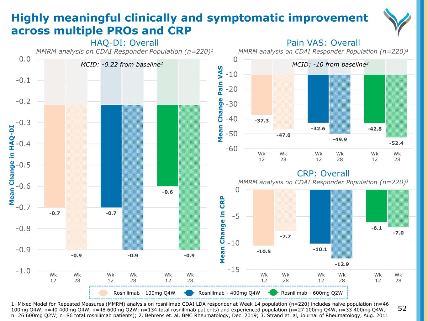 0% 5% 10% 15% 20% % o f P a ti e n ts CDAI Remission: b/tsDMARD-Experienced NRI+W18 analysis* on ITT population (n=130 rosnilimab patients)1 Wk 12 Wk 28 Wk 12 Wk 28 Wk 12 Wk 28 100mg Q4W 400mg Q4W 600mg Q2W 7% 9% 12% CDAI Remission at Week 28 Arm NRI NRI+W18 b/tsDMARD-Experienced Population (as graphed) 100mg 14% 16% 400mg 16% 16% 600mg 15% 17% b/tsDMARD-Naïve Population 100mg 21% 21% 400mg 18% 18% 600mg 17% 19% 15% 16% 14% 16% 17% JAK-like CDAI remission rates which deepened into six months Includes 29% with prior JAK experience Excludes 2 patients who discontinued in the all-active treatment period while in CDAI remission 1. Non-responder imputated (NRI) analysis on intent-to-treat (ITT) of all b/tsDMARD-experienced patients randomized; b/tsDMARD-experienced population (n=44 100mg Q4W, n=45 400mg Q4W, n=41 600mg Q2W; n=130 total rosnilimab b/tsDMARD-experienced patients) * NRI+W18: adds to NRI analysis additional responders at Week 18 who were not in all-active treatment period 51