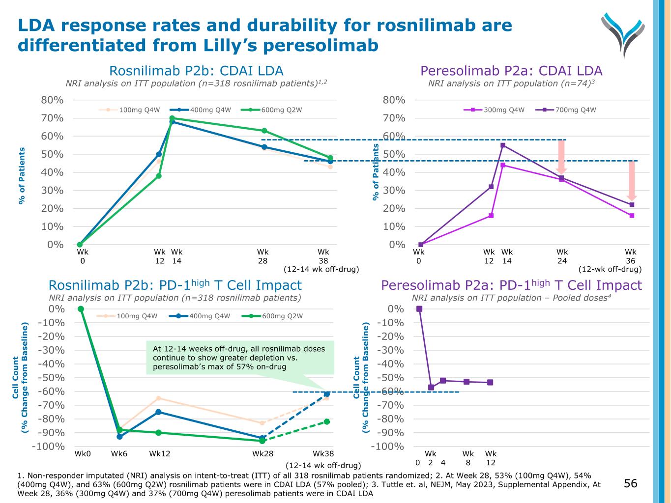 0% 10% 20% 30% 40% 50% 60% 70% 80% % o f P a ti en ts 100mg Q4W 400mg Q4W 600mg Q2W Wk 12 Wk 14 Wk 28 0% 10% 20% 30% 40% 50% 60% 70% 80% % o f P a ti en ts 300mg Q4W 700mg Q4W Wk 12 Wk 14 Wk 24 Wk 0 Wk 0 (12-wk off-drug) Wk 38 (12-14 wk off-drug) Wk 36 Rosnilimab P2b: CDAI LDA NRI analysis on ITT population (n=318 rosnilimab patients)1,2 Peresolimab P2a: CDAI LDA NRI analysis on ITT population (n=74)3 -100% -90% -80% -70% -60% -50% -40% -30% -20% -10% 0% C el l C o u n t (% C h a n g e fr o m B a se li n e) 100mg Q4W 400mg Q4W 600mg Q2W Wk0 Wk6 Wk12 Wk28 -100% -90% -80% -70% -60% -50% -40% -30% -20% -10% 0% C el l C o u n t (% C h a n g e fr o m B a se li n e) Wk 0 2 4 Wk 12 Wk 8 Wk38 (12-14 wk off-drug) Rosnilimab P2b: PD-1high T Cell Impact NRI analysis on ITT population (n=318 rosnilimab patients) Peresolimab P2a: PD-1high T Cell Impact NRI analysis on ITT population – Pooled doses4 At 12-14 weeks off-drug, all rosnilimab doses continue to show greater depletion vs. peresolimab’s max of 57% on-drug 56 LDA response rates and durability for rosnilimab are differentiated from Lilly’s peresolimab 1. Non-responder imputated (NRI) analysis on intent-to-treat (ITT) of all 318 rosnilimab patients randomized; 2. At Week 28, 53% (100mg Q4W), 54% (400mg Q4W), and 63% (600mg Q2W) rosnilimab patients were in CDAI LDA (57% pooled); 3. Tuttle et. al, NEJM, May 2023, Supplemental Appendix, At Week 28, 36% (300mg Q4W) and 37% (700mg Q4W) peresolimab patients were in CDAI LDA