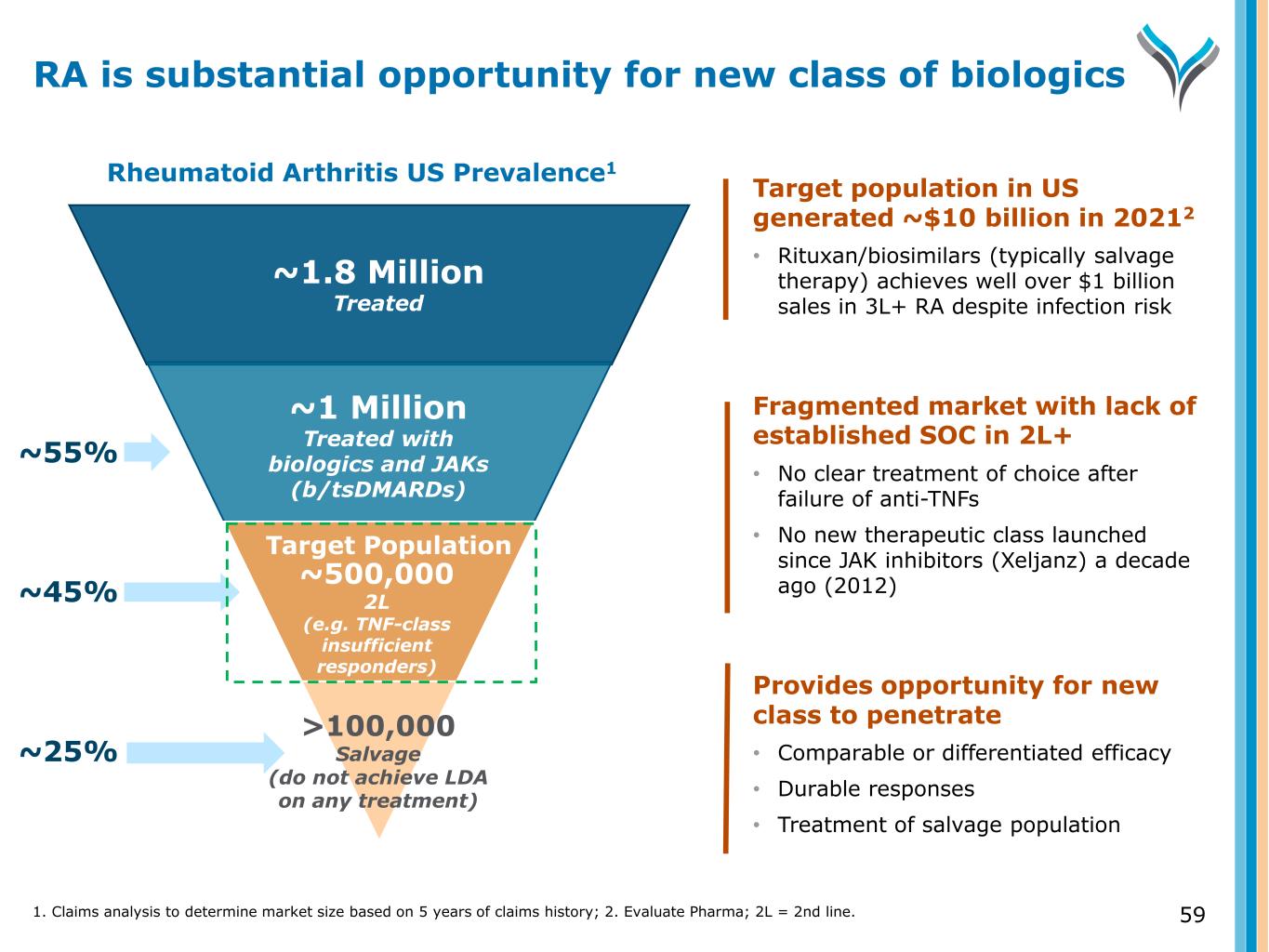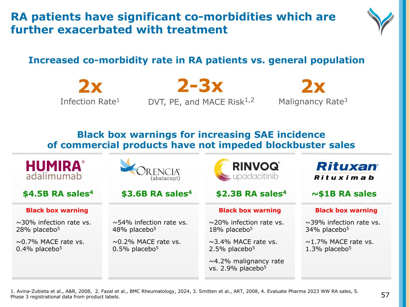 Black box warnings for increasing SAE incidence of commercial products have not impeded blockbuster sales Black box warning ~30% infection rate vs. 28% placebo5 ~0.7% MACE rate vs. 0.4% placebo5 ~54% infection rate vs. 48% placebo5 ~0.2% MACE rate vs. 0.5% placebo5 Black box warning ~20% infection rate vs. 18% placebo5 ~3.4% MACE rate vs. 2.5% placebo5 ~4.2% malignancy rate vs. 2.9% placebo5 Black box warning ~39% infection rate vs. 34% placebo5 ~1.7% MACE rate vs. 1.3% placebo5 Increased co-morbidity rate in RA patients vs. general population 2-3x DVT, PE, and MACE Risk1,2 2x Infection Rate1 2x Malignancy Rate3 $4.5B RA sales4 $3.6B RA sales4 $2.3B RA sales4 ~$1B RA sales RA patients have significant co-morbidities which are further exacerbated with treatment 1. Avina-Zubieta et al., A&R, 2008, 2. Fazal et al., BMC Rheumatology, 2024, 3. Smitten et al., ART, 2008, 4. Evaluate Pharma 2023 WW RA sales, 5. Phase 3 registrational data from product labels. 57