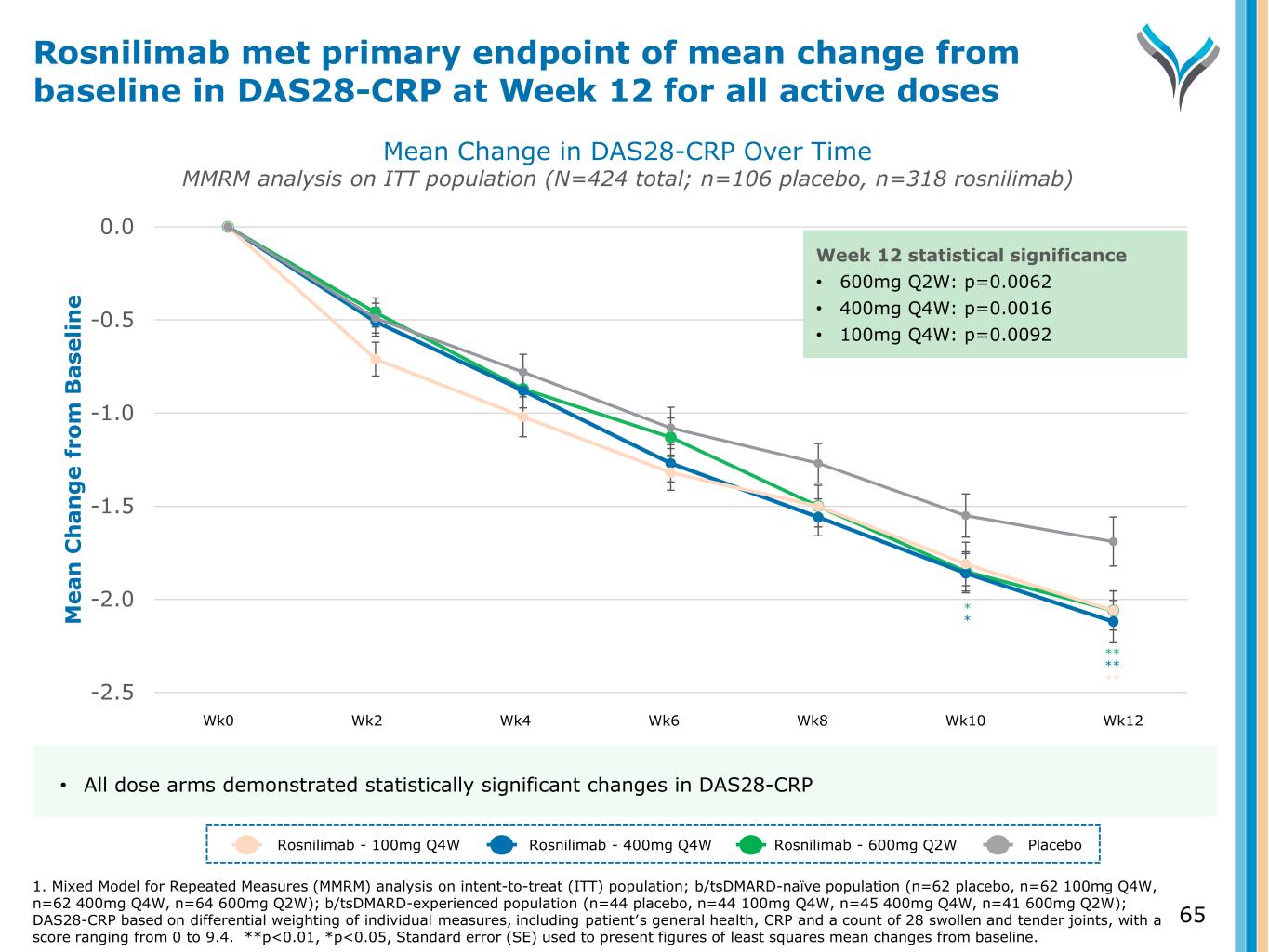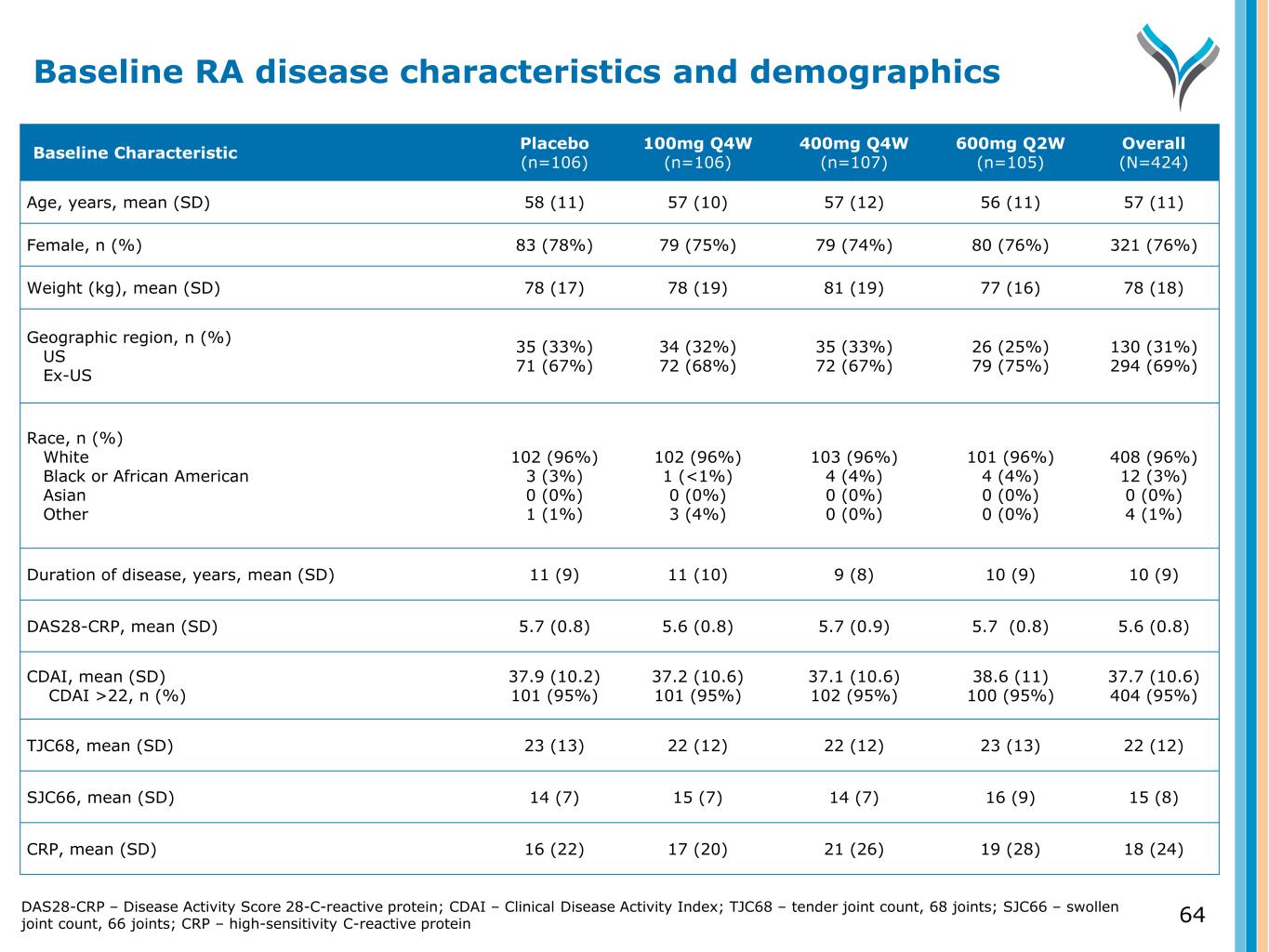 64 Baseline Characteristic Placebo (n=106) 100mg Q4W (n=106) 400mg Q4W (n=107) 600mg Q2W (n=105) Overall (N=424) Age, years, mean (SD) 58 (11) 57 (10) 57 (12) 56 (11) 57 (11) Female, n (%) 83 (78%) 79 (75%) 79 (74%) 80 (76%) 321 (76%) Weight (kg), mean (SD) 78 (17) 78 (19) 81 (19) 77 (16) 78 (18) Geographic region, n (%) US Ex-US 35 (33%) 71 (67%) 34 (32%) 72 (68%) 35 (33%) 72 (67%) 26 (25%) 79 (75%) 130 (31%) 294 (69%) Race, n (%) White Black or African American Asian Other 102 (96%) 3 (3%) 0 (0%) 1 (1%) 102 (96%) 1 (<1%) 0 (0%) 3 (4%) 103 (96%) 4 (4%) 0 (0%) 0 (0%) 101 (96%) 4 (4%) 0 (0%) 0 (0%) 408 (96%) 12 (3%) 0 (0%) 4 (1%) Duration of disease, years, mean (SD) 11 (9) 11 (10) 9 (8) 10 (9) 10 (9) DAS28-CRP, mean (SD) 5.7 (0.8) 5.6 (0.8) 5.7 (0.9) 5.7 (0.8) 5.6 (0.8) CDAI, mean (SD) CDAI >22, n (%) 37.9 (10.2) 101 (95%) 37.2 (10.6) 101 (95%) 37.1 (10.6) 102 (95%) 38.6 (11) 100 (95%) 37.7 (10.6) 404 (95%) TJC68, mean (SD) 23 (13) 22 (12) 22 (12) 23 (13) 22 (12) SJC66, mean (SD) 14 (7) 15 (7) 14 (7) 16 (9) 15 (8) CRP, mean (SD) 16 (22) 17 (20) 21 (26) 19 (28) 18 (24) Baseline RA disease characteristics and demographics DAS28-CRP – Disease Activity Score 28-C-reactive protein; CDAI – Clinical Disease Activity Index; TJC68 – tender joint count, 68 joints; SJC66 – swollen joint count, 66 joints; CRP – high-sensitivity C-reactive protein