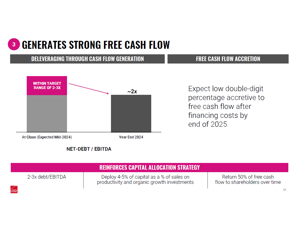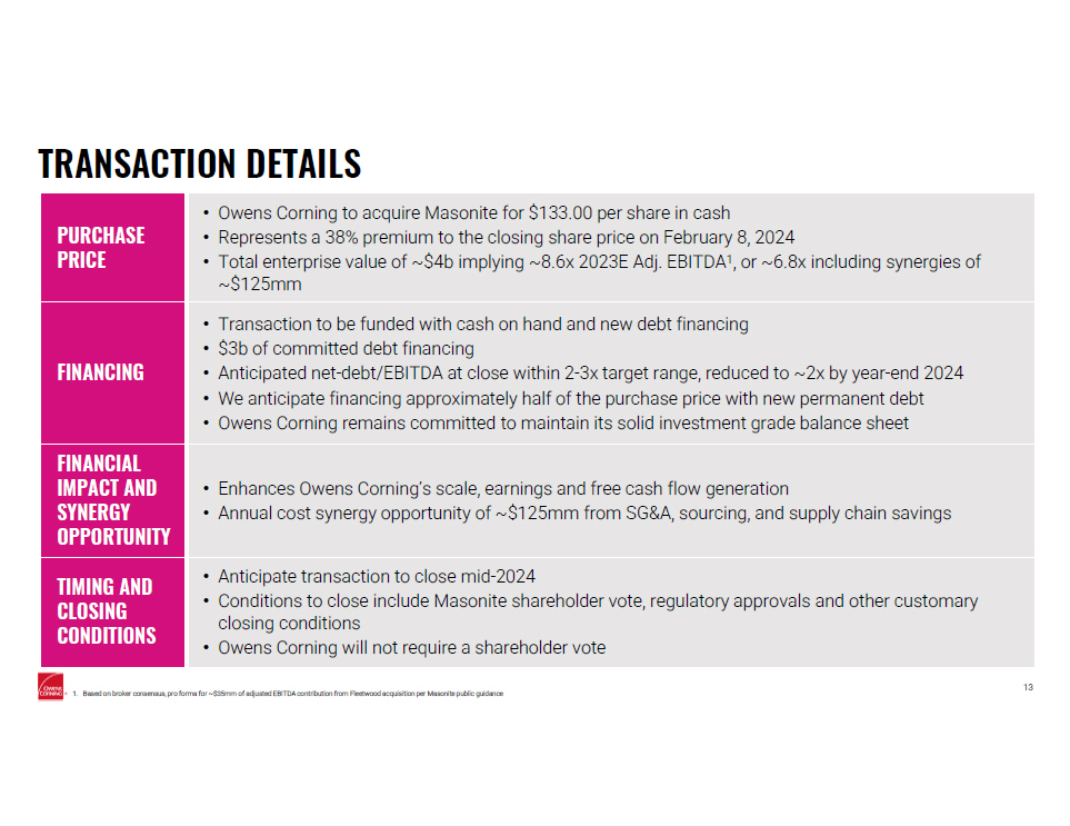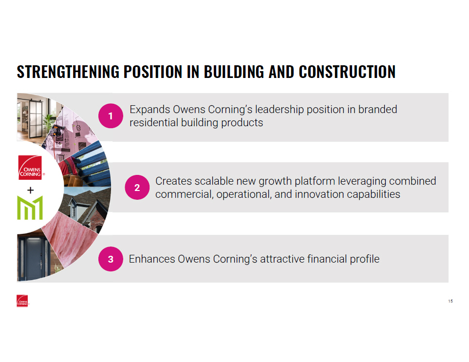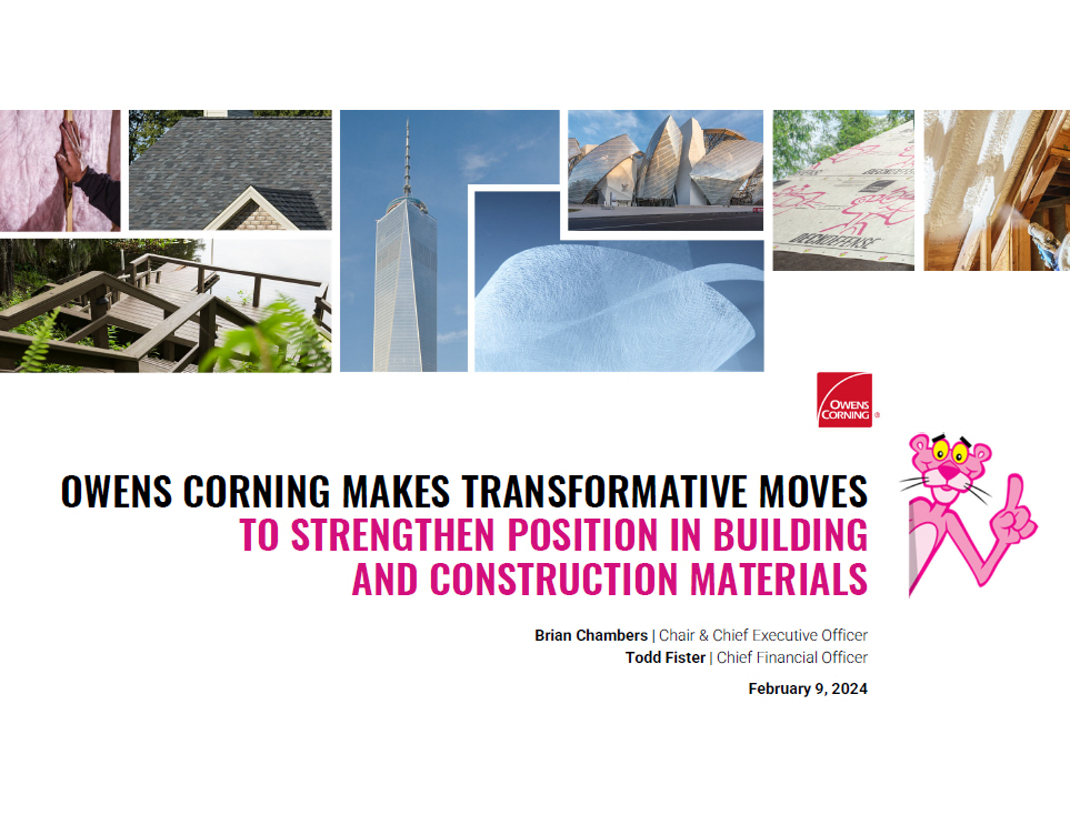OWENS CORNING MAKES TRANSFORMATIVE MOVES TO STRENGTHEN POSITION IN BUILDING AND CONSTRUCTION MATERIALS February 9, 2024 Brian Chambers | Chair & Chief Executive Officer Todd Fister | Chief Financial Officer