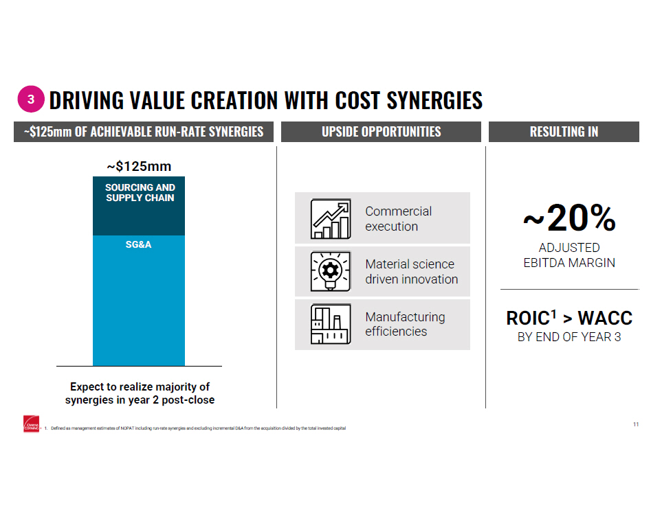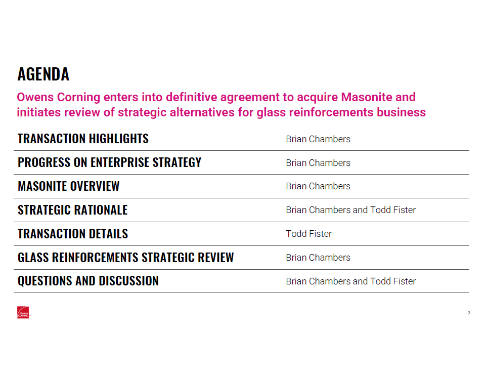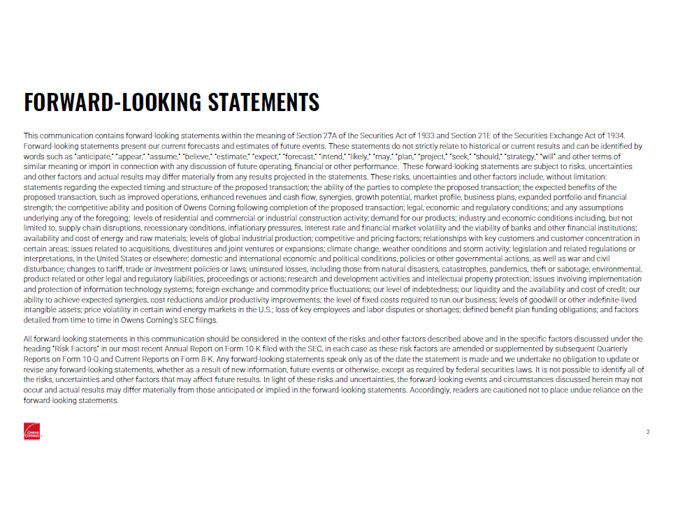 FORWARD - LOOKING STATEMENTS 2 This communication contains forward - looking statements within the meaning of Section 27A of the Securities Act of 1933 and Secti on 21E of the Securities Exchange Act of 1934. Forward - looking statements present our current forecasts and estimates of future events. These statements do not strictly relate to historical or current results and can be identified by words such as “anticipate,” “appear,” “assume,” “believe,” “estimate,” “expect,” “forecast,” “intend,” “likely,” “may,” “plan ,” “project,” “seek,” “should,” “strategy,” “will” and other terms of similar meaning or import in connection with any discussion of future operating, financial or other performance. These forward - looking statements are subject to risks, uncertainties and other factors and actual results may differ materially from any results projected in the statements. These risks, uncerta int ies and other factors include, without limitation: statements regarding the expected timing and structure of the proposed transaction; the ability of the parties to complete th e p roposed transaction; the expected benefits of the proposed transaction, such as improved operations, enhanced revenues and cash flow, synergies, growth potential, market profi le, business plans, expanded portfolio and financial strength; the competitive ability and position of Owens Corning following completion of the proposed transaction; legal, econ omi c and regulatory conditions; and any assumptions underlying any of the foregoing; levels of residential and commercial or industrial construction activity; demand for our produ cts; industry and economic conditions including, but not limited to, supply chain disruptions, recessionary conditions, inflationary pressures, interest rate and financial market vol ati lity and the viability of banks and other financial institutions; availability and cost of energy and raw materials; levels of global industrial production; competitive and pricing factors; r ela tionships with key customers and customer concentration in certain areas; issues related to acquisitions, divestitures and joint ventures or expansions; climate change, weather conditi ons and storm activity; legislation and related regulations or interpretations, in the United States or elsewhere; domestic and international economic and political conditions, policies or ot her governmental actions, as well as war and civil disturbance; changes to tariff, trade or investment policies or laws; uninsured losses, including those from natural disaster s, catastrophes, pandemics, theft or sabotage; environmental, product - related or other legal and regulatory liabilities, proceedings or actions; research and development activities and intel lectual property protection; issues involving implementation and protection of information technology systems; foreign exchange and commodity price fluctuations; our level of indebtednes s; our liquidity and the availability and cost of credit; our ability to achieve expected synergies, cost reductions and/or productivity improvements; the level of fixed costs required to ru n our business; levels of goodwill or other indefinite - lived intangible assets; price volatility in certain wind energy markets in the U.S.; loss of key employees and labor disputes or s hor tages; defined benefit plan funding obligations; and factors detailed from time to time in Owens Corning’s SEC filings. All forward - looking statements in this communication should be considered in the context of the risks and other factors describe d above and in the specific factors discussed under the heading “Risk Factors” in our most recent Annual Report on Form 10 - K filed with the SEC, in each case as these risk factors are amended or supplemented by subsequent Quarterly Reports on Form 10 - Q and Current Reports on Form 8 - K . Any forward - looking statements speak only as of the date the statement is made and we undertake no obligation to update or revise any forward - looking statements, whether as a result of new information, future events or otherwise, except as required by federal securities laws. It is not possible to identify all of the risks, uncertainties and other factors that may affect future results. In light of these risks and uncertainties, the for war d - looking events and circumstances discussed herein may not occur and actual results may differ materially from those anticipated or implied in the forward - looking statements. Accordingly, readers are cautioned not to place undue reliance on the forward - looking statements.
