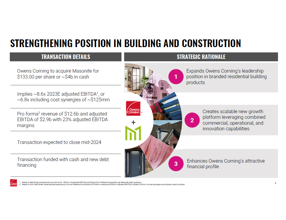 3 AGENDA TRANSACTION HIGHLIGHTS Brian Chambers PROGRESS ON ENTERPRISE STRATEGY Brian Chambers MASONITE OVERVIEW Brian Chambers STRATEGIC RATIONALE Brian Chambers and Todd Fister TRANSACTION DETAILS Todd Fister GLASS REINFORCEMENTS STRATEGIC REVIEW Brian Chambers QUESTIONS AND DISCUSSION Brian Chambers and Todd Fister Owens Corning enters into definitive agreement to acquire Masonite and initiates review of strategic alternatives for glass reinforcements business