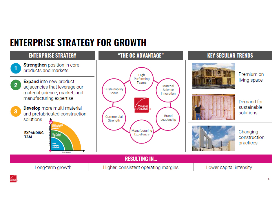 STRENGTHENING POSITION IN BUILDING AND CONSTRUCTION 1 2 Creates scalable n ew g rowth platform l everaging c ombined c ommercial, operational, and innovation c apabilities 3 + Owens Corning to acquire Masonite for $133.00 per share or ~$4b in cash Implies ~8.6x 2023E adjusted EBITDA 1 , or ~6.8x including cost synergies of ~$125mm Pro forma 2 revenue of $12.6b and adjusted EBITDA of $2.9b with 23% adjusted EBITDA margins Transaction expected to close mid - 2024 Transaction funded with cash and new debt financing TRANSACTION DETAILS STRATEGIC RATIONALE Expands Owens Corning’s leadership position in branded residential b uilding products Enhances Owens Corning’ s a t tractive financial profile 1. Based on Wall Street consensus plus pro forma for ~$35mm of adjusted EBITDA contribution from Fleetwood acquisition per Mason ite public guidance 2. Based on 2023 Wall Street consensus estimates plus pro forma Fleetwood contribution of $150mm revenue and $35mm adjusted EBITDA; includes $125mm run - rate synergies and excludes costs to achieve 4