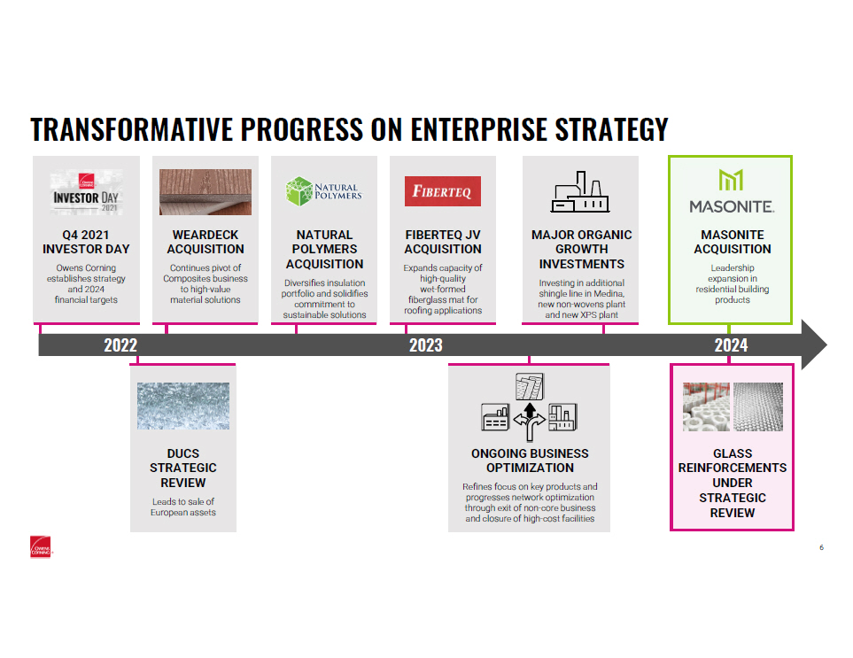 Strengthen position in core products and markets Expand into new product adjacencies that leverage our material science, market, and manufacturing expertise Develop more multi - material and prefabricated construction solutions ENTERPRISE STRATEGY FOR GROWTH ENTERPRISE STRATEGY “THE OC ADVANTAGE” KEY SECULAR TRENDS RESULTING IN… Long - term growth Higher, consistent operating margins Lower capital intensity 5 Time Horizon Multi - material & Prefabricated Solutions Core Products & Markets Expanding Addressable Market $200 B $40B New Product Adjacencies EXPANDING TAM High Performing Teams Material Science Innovation Brand Leadership Manufacturing Excellence Commercial Strength Sustainability Focus 1 2 3 Premium on living space Demand for sustainable solutions Changing construction practices