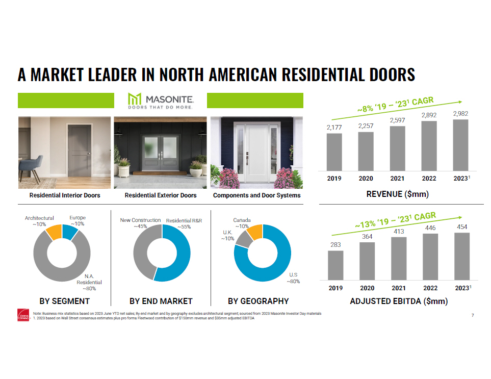 ONGOING BUSINESS OPTIMIZATION Refines focus on key products and progresses network optimization through exit of non - core business and closure of high - cost facilities TRANSFORMATIVE PROGRESS ON ENTERPRISE STRATEGY 6 Q4 2021 INVESTOR DAY Owens Corning establishes strategy and 2024 financial targets MASONITE ACQUISITION Leadership expansion in residential building products WEARDECK ACQUISITION Continues pivot of Composites business to high - value material solutions GLASS REINFORCEMENTS UNDER STRATEGI C REVIEW NATURAL POLYMERS ACQUISITION Diversifies insulation portfolio and solidifies commitment to sustainable solutions FIBERTEQ JV ACQUISITION Expands capacity of high - quality wet - formed fiberglass mat for roofing applications MAJOR ORGANIC GROWTH INVESTMENTS Investing in additional shingle line in Medina, new non - wovens plant and new XPS plant 2022 2024 2023 DUCS STRATEGIC REVIEW Leads to sale of European assets