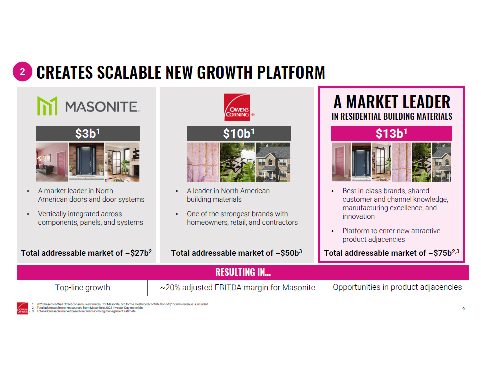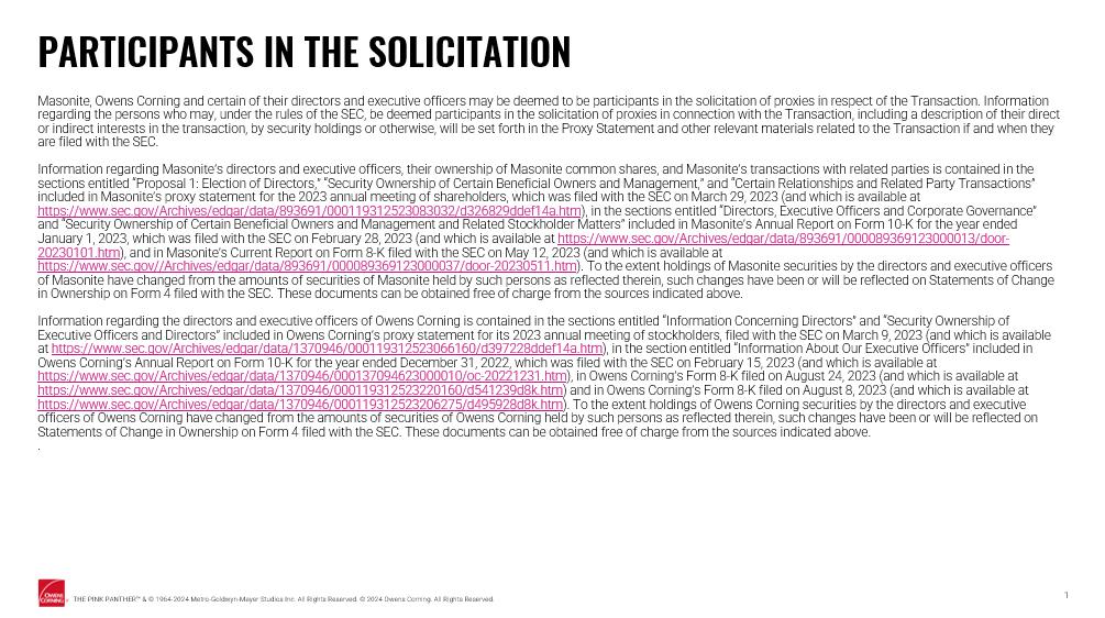 PARTICIPANTS IN THE SOLICITATION Masonite, Owens Corning and certain of their directors and executive officers may be deemed to be participants in the solicit ati on of proxies in respect of the Transaction. Information regarding the persons who may, under the rules of the SEC, be deemed participants in the solicitation of proxies in connectio n w ith the Transaction, including a description of their direct or indirect interests in the transaction, by security holdings or otherwise, will be set forth in the Proxy Statement and oth er relevant materials related to the Transaction if and when they are filed with the SEC. Information regarding Masonite’s directors and executive officers, their ownership of Masonite common shares, and Masonite’s tra nsactions with related parties is contained in the sections entitled “Proposal 1: Election of Directors,” “Security Ownership of Certain Beneficial Owners and Management,” and “Ce rtain Relationships and Related Party Transactions” included in Masonite’s proxy statement for the 2023 annual meeting of shareholders, which was filed with the SEC on March 29, 20 23 (and which is available at https://www.sec.gov/Archives/edgar/data/893691/000119312523083032/d326829ddef14a.htm ), in the sections entitled “Directors, Executive Officers and Corporate Governance” and “Security Ownership of Certain Beneficial Owners and Management and Related Stockholder Matters” included in Masonite’s A nnu al Report on Form 10 - K for the year ended January 1, 2023, which was filed with the SEC on February 28, 2023 (and which is available at https://www.sec.gov/Archives/edgar/data/893691/000089369123000013/door - 20230101.htm ), and in Masonite’s Current Report on Form 8 - K filed with the SEC on May 12, 2023 (and which is available at https://www.sec.gov//Archives/edgar/data/893691/000089369123000037/door - 20230511.htm ). To the extent holdings of Masonite securities by the directors and executive officers of Masonite have changed from the amounts of securities of Masonite held by such persons as reflected therein, such changes h ave been or will be reflected on Statements of Change in Ownership on Form 4 filed with the SEC. These documents can be obtained free of charge from the sources indicated above. Information regarding the directors and executive officers of Owens Corning is contained in the sections entitled “Informatio n C oncerning Directors” and “Security Ownership of Executive Officers and Directors” included in Owens Corning’s proxy statement for its 2023 annual meeting of stockholders, fi led with the SEC on March 9, 2023 (and which is available at https://www.sec.gov/Archives/edgar/data/1370946/000119312523066160/d397228ddef14a.htm ), in the section entitled “Information About Our Executive Officers” included in Owens Corning’s Annual Report on Form 10 - K for the year ended December 31, 2022, which was filed with the SEC on February 15, 20 23 (and which is available at https://www.sec.gov/Archives/edgar/data/1370946/000137094623000010/oc - 20221231.htm ), in Owen Corning’s Form 8 - K filed on August 24, 2023 (and which is available at https://www.sec.gov/Archives/edgar/data/1370946/000119312523220160/d541239d8k.htm ) and in Owen Corning’s Form 8 - K filed on August 8, 2023 (and which is available at https://www.sec.gov/Archives/edgar/data/1370946/000119312523206275/d495928d8k.htm ). To the extent holdings of Owens Corning securities by the directors and executive officers of Owens Corning have changed from the amounts of securities of Owens Corning held by such persons as reflected ther ein , such changes have been or will be reflected on Statements of Change in Ownership on Form 4 filed with the SEC. These documents can be obtained free of charge from the sourc es indicated above. . 17 THE PINK PANTHER Ӵ & © 1964 - 2024 Metro - Goldwyn - Mayer Studios Inc. All Rights Reserved. © 2024 Owens Corning. All Rights Reserved.