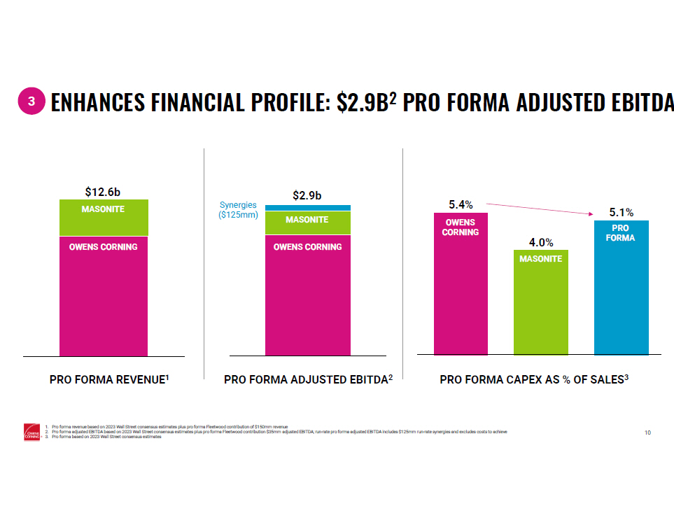 9 • Best in - class brands, shared customer and channel knowledge, manufacturing excellence, and innovation • Platform to enter new attractive product adjacencies A MARKET LEADER IN RESIDENTIAL BUILDING MATERIALS • A market leader in North American doors and door systems • Vertically integrated across components, panels, and systems Total addressable market of ~$50b 3 Total addressable market of ~$27b 2 Total addressable market of ~$75b 2,3 • A leader in North American building materials • One of the strongest brands with homeowners, retail, and contractors RESULTING IN… ~20% adjusted EBITDA margin for Masonite Opportunities in product adjacencies $3b 1 $10b 1 $13b 1 CREATES SCALABLE NEW GROWTH PLATFORM 2 Top - line growth 1. 2023 based on Wall Street consensus estimates; for Masonite, pro forma Fleetwood contribution of $150mm revenue is included 2. Total addressable market sourced from Masonite’s 2023 Investor Day materials 3. Total addressable market based on Owens Corning management estimate