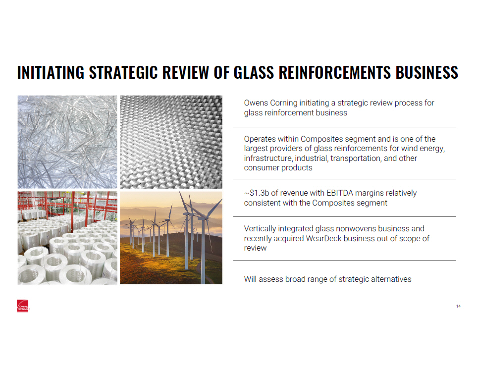 INITIATING STRATEGIC REVIEW OF GLASS REINFORCEMENTS BUSINESS Owens Corning initiating a strategic review process for glass reinforcement business Operates within Composites segment and is one of the largest providers of glass reinforcements for wind energy, infrastructure, industrial, transportation, and other consumer products ~$1.3b of revenue with EBITDA margins relatively consistent with the Composites segment Vertically integrated glass nonwovens business and recently acquired WearDeck business out of scope of review Will assess broad range of strategic alternatives 14