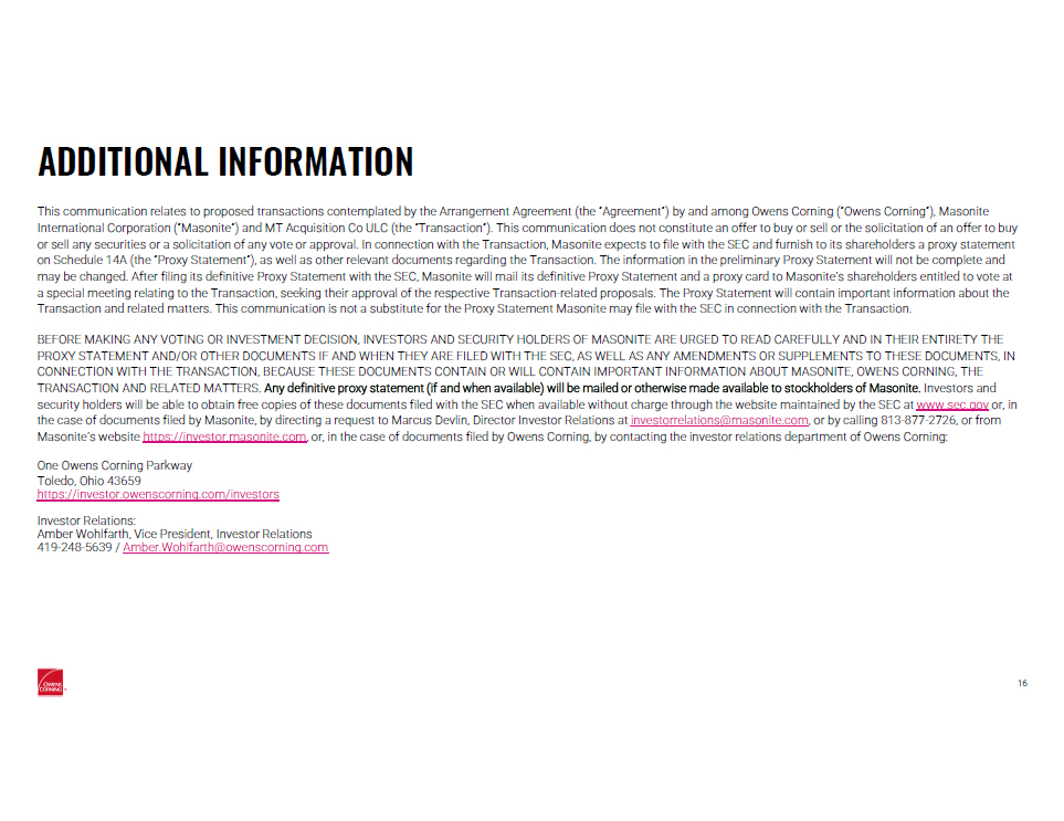 ADDITIONAL INFORMATION This communication relates to proposed transactions contemplated by the Arrangement Agreement (the “Agreement”) by and among Owe ns Corning (“Owens Corning”), Masonite International Corporation (“Masonite”) and MT Acquisition Co ULC (the “Transaction”). This communication does not constitute an offer to buy or sell or the solicitation of an offer to buy or sell any securities or a solicitation of any vote or approval. In connection with the Transaction, Masonite expects to fil e w ith the SEC and furnish to its shareholders a proxy statement on Schedule 14A (the “Proxy Statement”), as well as other relevant documents regarding the Transaction. The information in th e p reliminary Proxy Statement will not be complete and may be changed. After filing its definitive Proxy Statement with the SEC, Masonite will mail its definitive Proxy Statement a nd a proxy card to Masonite’s shareholders entitled to vote at a special meeting relating to the Transaction, seeking their approval of the respective Transaction - related proposals. The Proxy Statement will contain important information about the Transaction and related matters. This communication is not a substitute for the Proxy Statement Masonite may file with the SE C i n connection with the Transaction. BEFORE MAKING ANY VOTING OR INVESTMENT DECISION, INVESTORS AND SECURITY HOLDERS OF MASONITE ARE URGED TO READ CAREFULLY AND I N T HEIR ENTIRETY THE PROXY STATEMENT AND/OR OTHER DOCUMENTS IF AND WHEN THEY ARE FILED WITH THE SEC, AS WELL AS ANY AMENDMENTS OR SUPPLEMENTS TO T HES E DOCUMENTS, IN CONNECTION WITH THE TRANSACTION, BECAUSE THESE DOCUMENTS CONTAIN OR WILL CONTAIN IMPORTANT INFORMATION ABOUT MASONITE, OWENS COR NING, THE TRANSACTION AND RELATED MATTERS. Any definitive proxy statement (if and when available) will be mailed or otherwise made available to stockholders of Masonite . Investors and security holders will be able to obtain free copies of these documents filed with the SEC when available without charge throu gh the website maintained by the SEC at www.sec.gov or, in the case of documents filed by Masonite, by directing a request to Marcus Devlin, Director Investor Relations at investorrelations@masonite.com , or by calling 813 - 877 - 2726 , or from Masonite ’s website https://investor.masonite.com , or, in the case of documents filed by Owens Corning, by contacting the investor relations department of Owens Corning: One Owens Corning Parkway Toledo, Ohio 43659 https://investor.owenscorning.com/investors Investor Relations: Amber Wohlfarth, Vice President, Investor Relations 419 - 248 - 5639 / Amber.Wohlfarth@owenscorning.com 16