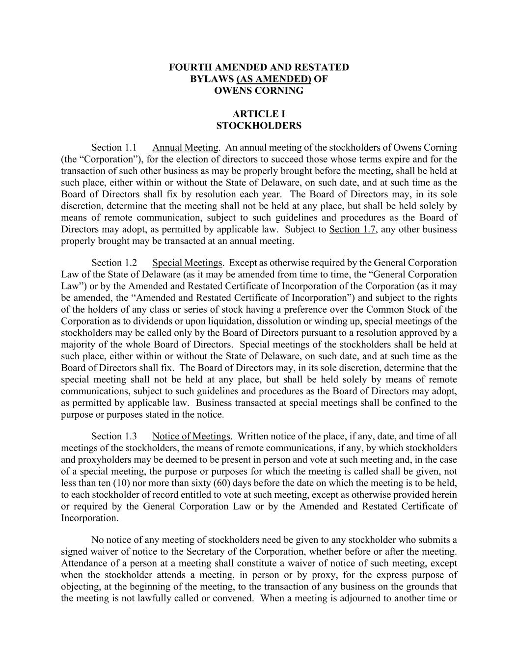 FOURTH AMENDED AND RESTATED BYLAWS (AS AMENDED) OF OWENS CORNING ARTICLE I STOCKHOLDERS Section 1.1 Annual Meeting. An annual meeting of the stockholders of Owens Corning (the “Corporation”), for the election of directors to succeed those whose terms expire and for the transaction of such other business as may be properly brought before the meeting, shall be held at such place, either within or without the State of Delaware, on such date, and at such time as the Board of Directors shall fix by resolution each year. The Board of Directors may, in its sole discretion, determine that the meeting shall not be held at any place, but shall be held solely by means of remote communication, subject to such guidelines and procedures as the Board of Directors may adopt, as permitted by applicable law. Subject to Section 1.7, any other business properly brought may be transacted at an annual meeting. Section 1.2 Special Meetings. Except as otherwise required by the General Corporation Law of the State of Delaware (as it may be amended from time to time, the “General Corporation Law”) or by the Amended and Restated Certificate of Incorporation of the Corporation (as it may be amended, the “Amended and Restated Certificate of Incorporation”) and subject to the rights of the holders of any class or series of stock having a preference over the Common Stock of the Corporation as to dividends or upon liquidation, dissolution or winding up, special meetings of the stockholders may be called only by the Board of Directors pursuant to a resolution approved by a majority of the whole Board of Directors. Special meetings of the stockholders shall be held at such place, either within or without the State of Delaware, on such date, and at such time as the Board of Directors shall fix. The Board of Directors may, in its sole discretion, determine that the special meeting shall not be held at any place, but shall be held solely by means of remote communications, subject to such guidelines and procedures as the Board of Directors may adopt, as permitted by applicable law. Business transacted at special meetings shall be confined to the purpose or purposes stated in the notice. Section 1.3 Notice of Meetings. Written notice of the place, if any, date, and time of all meetings of the stockholders, the means of remote communications, if any, by which stockholders and proxyholders may be deemed to be present in person and vote at such meeting and, in the case of a special meeting, the purpose or purposes for which the meeting is called shall be given, not less than ten (10) nor more than sixty (60) days before the date on which the meeting is to be held, to each stockholder of record entitled to vote at such meeting, except as otherwise provided herein or required by the General Corporation Law or by the Amended and Restated Certificate of Incorporation. No notice of any meeting of stockholders need be given to any stockholder who submits a signed waiver of notice to the Secretary of the Corporation, whether before or after the meeting. Attendance of a person at a meeting shall constitute a waiver of notice of such meeting, except when the stockholder attends a meeting, in person or by proxy, for the express purpose of objecting, at the beginning of the meeting, to the transaction of any business on the grounds that the meeting is not lawfully called or convened. When a meeting is adjourned to another time or