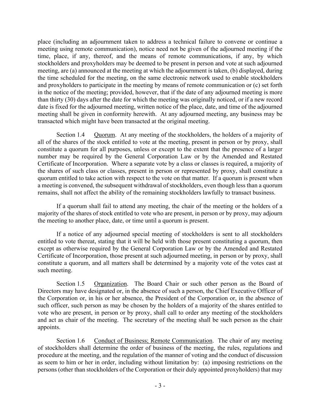 - 3 - place (including an adjournment taken to address a technical failure to convene or continue a meeting using remote communication), notice need not be given of the adjourned meeting if the time, place, if any, thereof, and the means of remote communications, if any, by which stockholders and proxyholders may be deemed to be present in person and vote at such adjourned meeting, are (a) announced at the meeting at which the adjournment is taken, (b) displayed, during the time scheduled for the meeting, on the same electronic network used to enable stockholders and proxyholders to participate in the meeting by means of remote communication or (c) set forth in the notice of the meeting; provided, however, that if the date of any adjourned meeting is more than thirty (30) days after the date for which the meeting was originally noticed, or if a new record date is fixed for the adjourned meeting, written notice of the place, date, and time of the adjourned meeting shall be given in conformity herewith. At any adjourned meeting, any business may be transacted which might have been transacted at the original meeting. Section 1.4 Quorum. At any meeting of the stockholders, the holders of a majority of all of the shares of the stock entitled to vote at the meeting, present in person or by proxy, shall constitute a quorum for all purposes, unless or except to the extent that the presence of a larger number may be required by the General Corporation Law or by the Amended and Restated Certificate of Incorporation. Where a separate vote by a class or classes is required, a majority of the shares of such class or classes, present in person or represented by proxy, shall constitute a quorum entitled to take action with respect to the vote on that matter. If a quorum is present when a meeting is convened, the subsequent withdrawal of stockholders, even though less than a quorum remains, shall not affect the ability of the remaining stockholders lawfully to transact business. If a quorum shall fail to attend any meeting, the chair of the meeting or the holders of a majority of the shares of stock entitled to vote who are present, in person or by proxy, may adjourn the meeting to another place, date, or time until a quorum is present. If a notice of any adjourned special meeting of stockholders is sent to all stockholders entitled to vote thereat, stating that it will be held with those present constituting a quorum, then except as otherwise required by the General Corporation Law or by the Amended and Restated Certificate of Incorporation, those present at such adjourned meeting, in person or by proxy, shall constitute a quorum, and all matters shall be determined by a majority vote of the votes cast at such meeting. Section 1.5 Organization. The Board Chair or such other person as the Board of Directors may have designated or, in the absence of such a person, the Chief Executive Officer of the Corporation or, in his or her absence, the President of the Corporation or, in the absence of such officer, such person as may be chosen by the holders of a majority of the shares entitled to vote who are present, in person or by proxy, shall call to order any meeting of the stockholders and act as chair of the meeting. The secretary of the meeting shall be such person as the chair appoints. Section 1.6 Conduct of Business; Remote Communication. The chair of any meeting of stockholders shall determine the order of business of the meeting, the rules, regulations and procedure at the meeting, and the regulation of the manner of voting and the conduct of discussion as seem to him or her in order, including without limitation by: (a) imposing restrictions on the persons (other than stockholders of the Corporation or their duly appointed proxyholders) that may