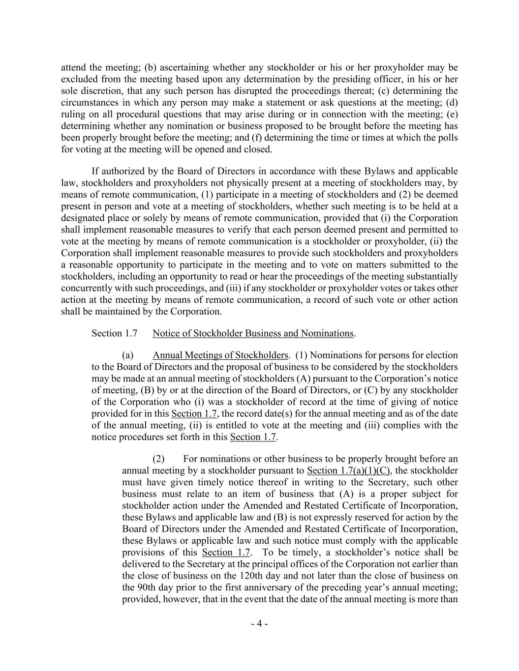 - 4 - attend the meeting; (b) ascertaining whether any stockholder or his or her proxyholder may be excluded from the meeting based upon any determination by the presiding officer, in his or her sole discretion, that any such person has disrupted the proceedings thereat; (c) determining the circumstances in which any person may make a statement or ask questions at the meeting; (d) ruling on all procedural questions that may arise during or in connection with the meeting; (e) determining whether any nomination or business proposed to be brought before the meeting has been properly brought before the meeting; and (f) determining the time or times at which the polls for voting at the meeting will be opened and closed. If authorized by the Board of Directors in accordance with these Bylaws and applicable law, stockholders and proxyholders not physically present at a meeting of stockholders may, by means of remote communication, (1) participate in a meeting of stockholders and (2) be deemed present in person and vote at a meeting of stockholders, whether such meeting is to be held at a designated place or solely by means of remote communication, provided that (i) the Corporation shall implement reasonable measures to verify that each person deemed present and permitted to vote at the meeting by means of remote communication is a stockholder or proxyholder, (ii) the Corporation shall implement reasonable measures to provide such stockholders and proxyholders a reasonable opportunity to participate in the meeting and to vote on matters submitted to the stockholders, including an opportunity to read or hear the proceedings of the meeting substantially concurrently with such proceedings, and (iii) if any stockholder or proxyholder votes or takes other action at the meeting by means of remote communication, a record of such vote or other action shall be maintained by the Corporation. Section 1.7 Notice of Stockholder Business and Nominations. (a) Annual Meetings of Stockholders. (1) Nominations for persons for election to the Board of Directors and the proposal of business to be considered by the stockholders may be made at an annual meeting of stockholders (A) pursuant to the Corporation’s notice of meeting, (B) by or at the direction of the Board of Directors, or (C) by any stockholder of the Corporation who (i) was a stockholder of record at the time of giving of notice provided for in this Section 1.7, the record date(s) for the annual meeting and as of the date of the annual meeting, (ii) is entitled to vote at the meeting and (iii) complies with the notice procedures set forth in this Section 1.7. (2) For nominations or other business to be properly brought before an annual meeting by a stockholder pursuant to Section 1.7(a)(1)(C), the stockholder must have given timely notice thereof in writing to the Secretary, such other business must relate to an item of business that (A) is a proper subject for stockholder action under the Amended and Restated Certificate of Incorporation, these Bylaws and applicable law and (B) is not expressly reserved for action by the Board of Directors under the Amended and Restated Certificate of Incorporation, these Bylaws or applicable law and such notice must comply with the applicable provisions of this Section 1.7. To be timely, a stockholder’s notice shall be delivered to the Secretary at the principal offices of the Corporation not earlier than the close of business on the 120th day and not later than the close of business on the 90th day prior to the first anniversary of the preceding year’s annual meeting; provided, however, that in the event that the date of the annual meeting is more than