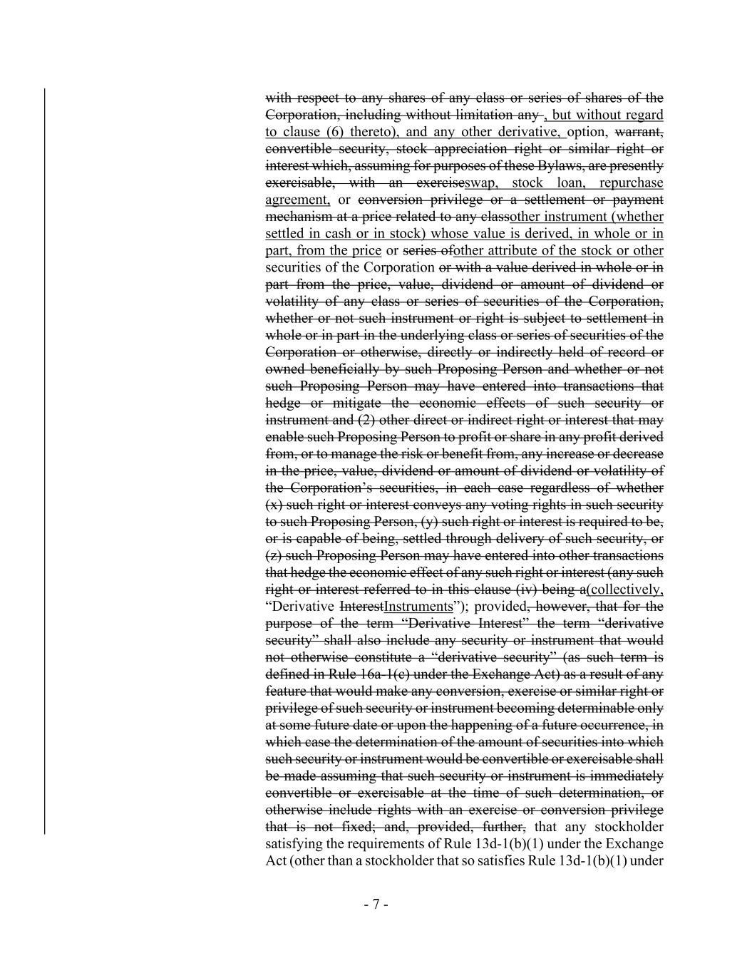 - 7 - with respect to any shares of any class or series of shares of the Corporation, including without limitation any , but without regard to clause (6) thereto), and any other derivative, option, warrant, convertible security, stock appreciation right or similar right or interest which, assuming for purposes of these Bylaws, are presently exercisable, with an exerciseswap, stock loan, repurchase agreement, or conversion privilege or a settlement or payment mechanism at a price related to any classother instrument (whether settled in cash or in stock) whose value is derived, in whole or in part, from the price or series ofother attribute of the stock or other securities of the Corporation or with a value derived in whole or in part from the price, value, dividend or amount of dividend or volatility of any class or series of securities of the Corporation, whether or not such instrument or right is subject to settlement in whole or in part in the underlying class or series of securities of the Corporation or otherwise, directly or indirectly held of record or owned beneficially by such Proposing Person and whether or not such Proposing Person may have entered into transactions that hedge or mitigate the economic effects of such security or instrument and (2) other direct or indirect right or interest that may enable such Proposing Person to profit or share in any profit derived from, or to manage the risk or benefit from, any increase or decrease in the price, value, dividend or amount of dividend or volatility of the Corporation’s securities, in each case regardless of whether (x) such right or interest conveys any voting rights in such security to such Proposing Person, (y) such right or interest is required to be, or is capable of being, settled through delivery of such security, or (z) such Proposing Person may have entered into other transactions that hedge the economic effect of any such right or interest (any such right or interest referred to in this clause (iv) being a(collectively, “Derivative InterestInstruments”); provided, however, that for the purpose of the term “Derivative Interest” the term “derivative security” shall also include any security or instrument that would not otherwise constitute a “derivative security” (as such term is defined in Rule 16a-1(c) under the Exchange Act) as a result of any feature that would make any conversion, exercise or similar right or privilege of such security or instrument becoming determinable only at some future date or upon the happening of a future occurrence, in which case the determination of the amount of securities into which such security or instrument would be convertible or exercisable shall be made assuming that such security or instrument is immediately convertible or exercisable at the time of such determination, or otherwise include rights with an exercise or conversion privilege that is not fixed; and, provided, further, that any stockholder satisfying the requirements of Rule 13d-1(b)(1) under the Exchange Act (other than a stockholder that so satisfies Rule 13d-1(b)(1) under